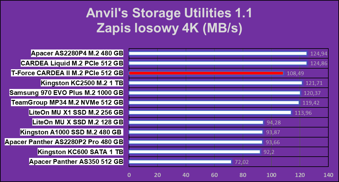 Ten z kolei test ukazuje wydajność dysku w najczęściej przeprowadzanych przez nas operacjach. Zwłaszcza kiedy na nośniku odpalamy system operacyjny i programy w tle. Tutaj zdecydowanie warto posłużyć się cyferkami, bo do testu wybrałem dwa najcięższe zadania z naszego asortymentu.