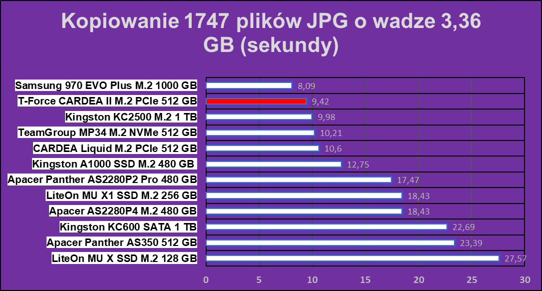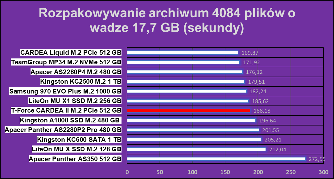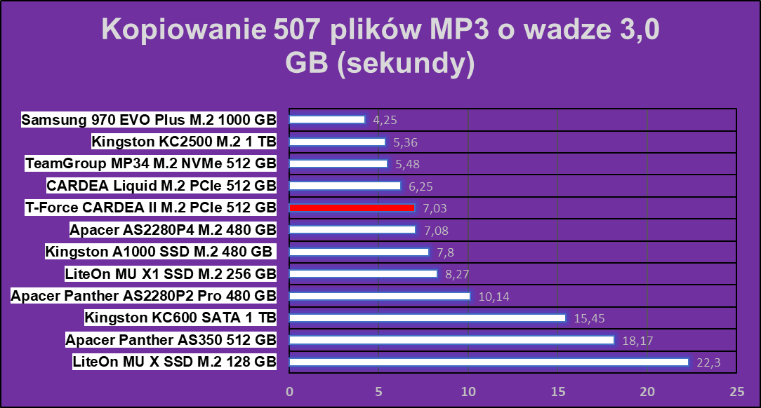 Świetne wyniki w testach syntetycznych niespecjalnie przekładają się na równie spektakularne owoce w operacjach na plikach. Zaskakuje wyjątkowo dobra wydajność w manipulacji wieloma małymi pliczkami, ale kiedy w grę wchodzą opasłe pliszczory, to już CARDEA II wymięka i to znacznie. Dziwne, jako że syntetyczny odczyt i zapis sekwencyjny wypadł wzorowo.