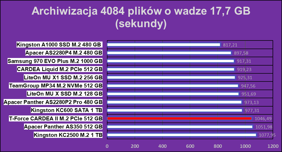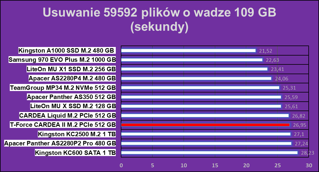 Tutaj sprawa ma się już inaczej, bo w teście z udziałem typowych działań na plikach liczy się to, jak szybko dysk poradzi sobie z wykonaniem postawionych mu zadań. Innymi słowy, im mniejszy słupek, tym lepiej.