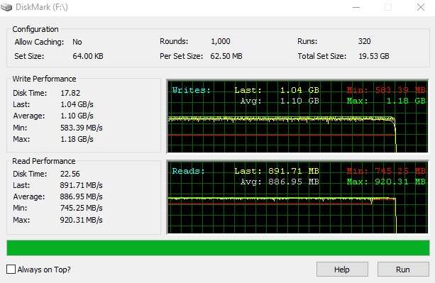 Wszystkie testy zostały przeprowadzone na 64-bitowym systemie operacyjnym Windows 10 Home i systemie plików NTFS z jednostką alokacji wynoszącą 4096 bajtów. Wyniki stanowią średnią z trzech przeprowadzonych w identycznych warunkach odczytów. Nie dajcie się zwieść występującym niekiedy przepaściom ukazanym na wykresach i przed wyciąganiem wniosków, rzućcie okiem na narzuconą skalę.