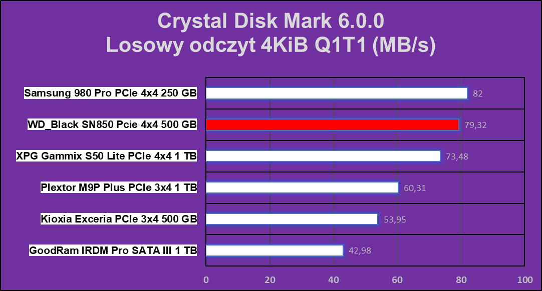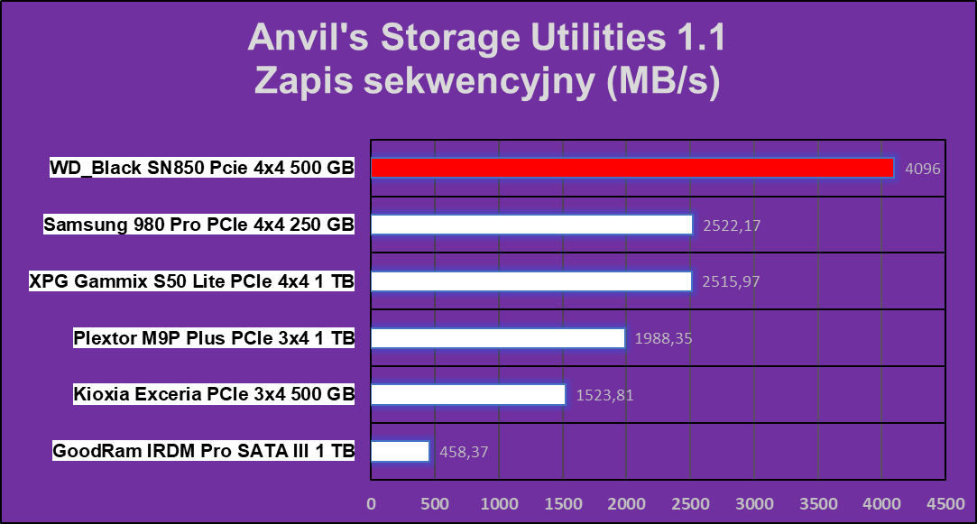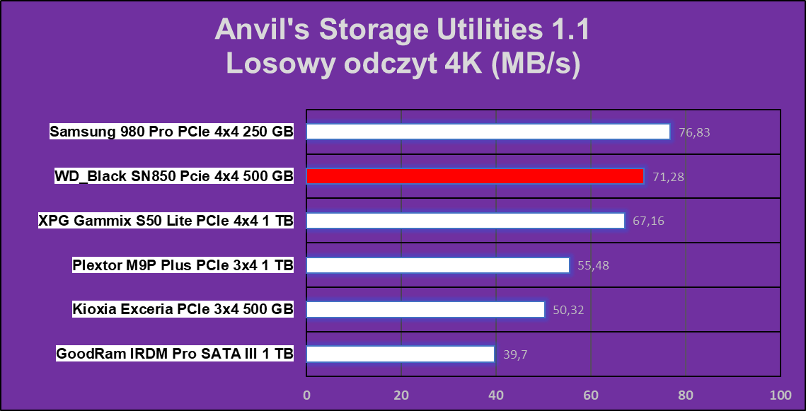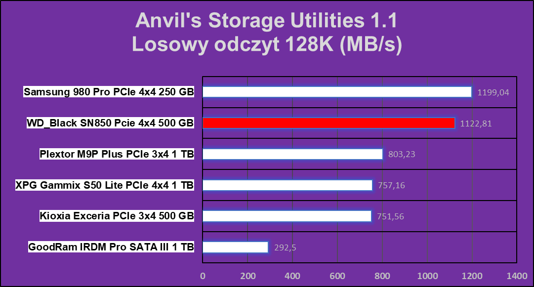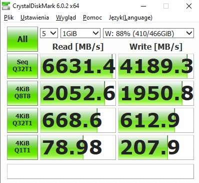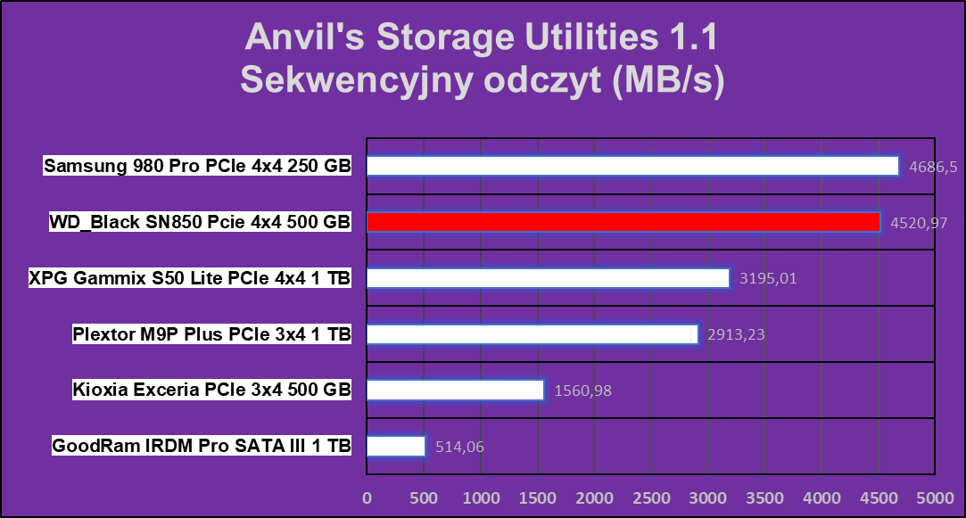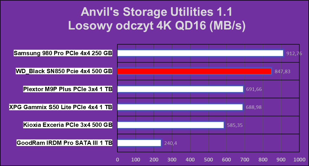 Dzięki tej konfiguracji 500-gigabajtowy WD Black SN850 (w rzeczywistości mamy dostęp do około 465 GB) może pochwalić się odczytem i zapisem sekwencyjnym do kolejno 7000 i 4100 MB/s, jak również 800000 operacjami IOPS.