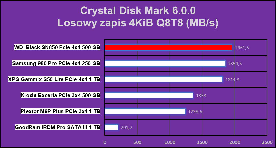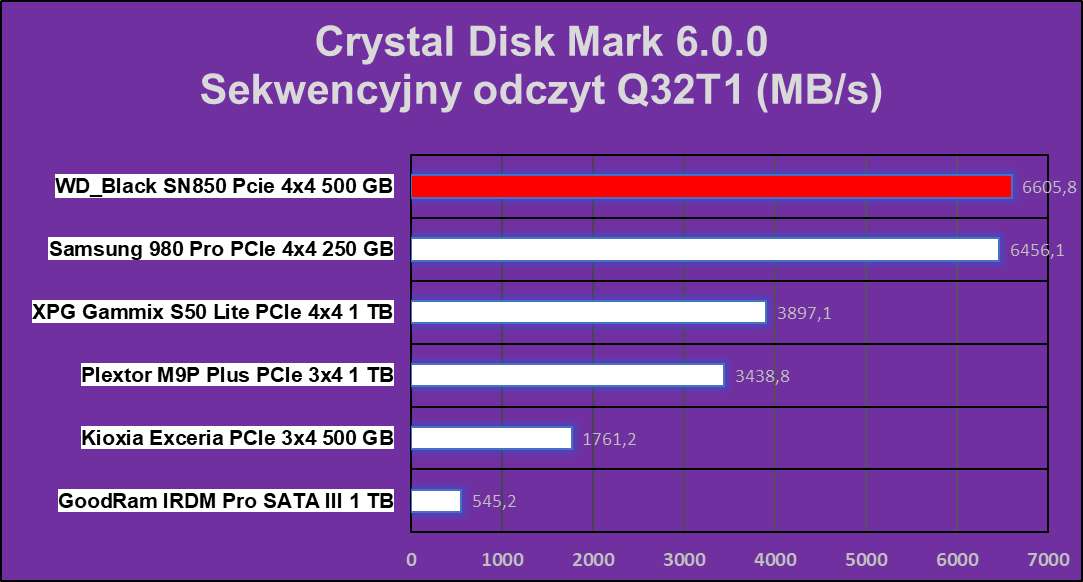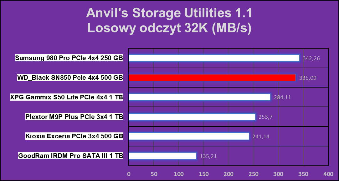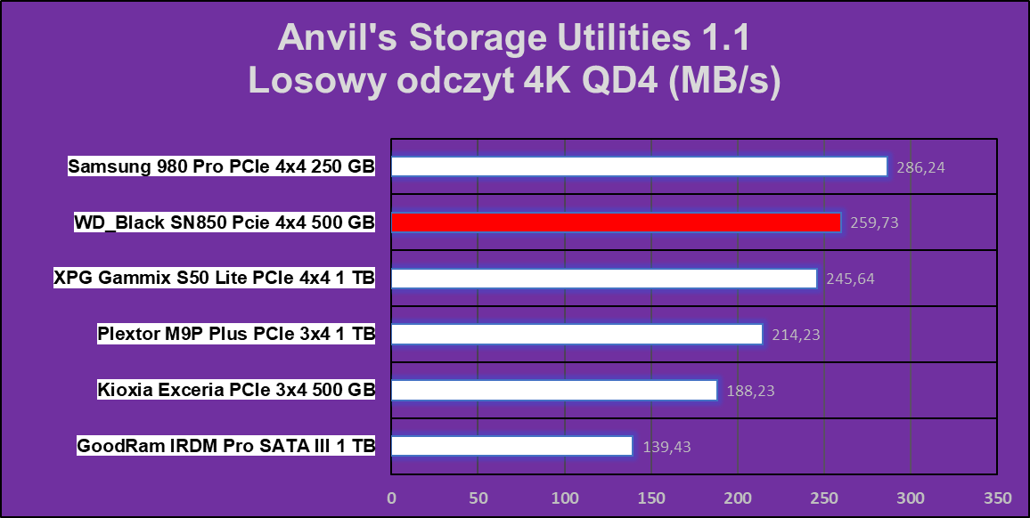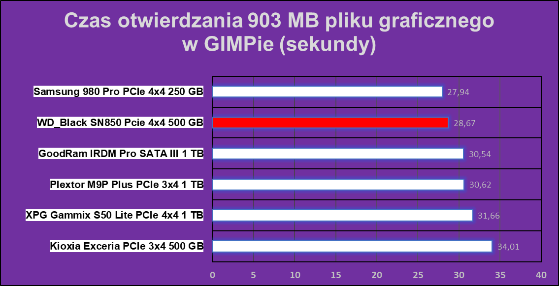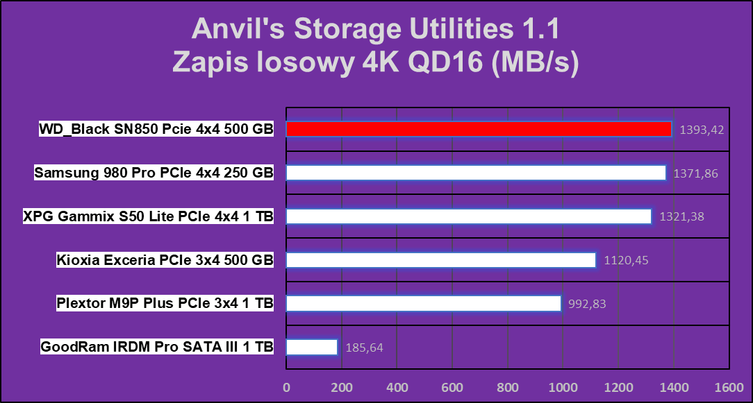 Dzięki tej konfiguracji 500-gigabajtowy WD Black SN850 (w rzeczywistości mamy dostęp do około 465 GB) może pochwalić się odczytem i zapisem sekwencyjnym do kolejno 7000 i 4100 MB/s, jak również 800000 operacjami IOPS.