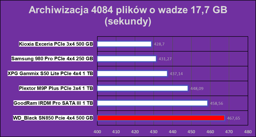 W przypadku wykonywania tych dwóch zadań jednocześnie, najlepiej byłoby, gdyby WD Black SN850 500 GB wykonał je w 467,65 sekundy. W rzeczywistości jednak wykonywanie obu zadań w jednym momencie wydłużyło czas kopiowania o około 35 sekund, a archiwizacji o 30 sekund. Finalnie jednak łącznie WD Black SN850 500 GB zaoszczędził nam 16 sekund.