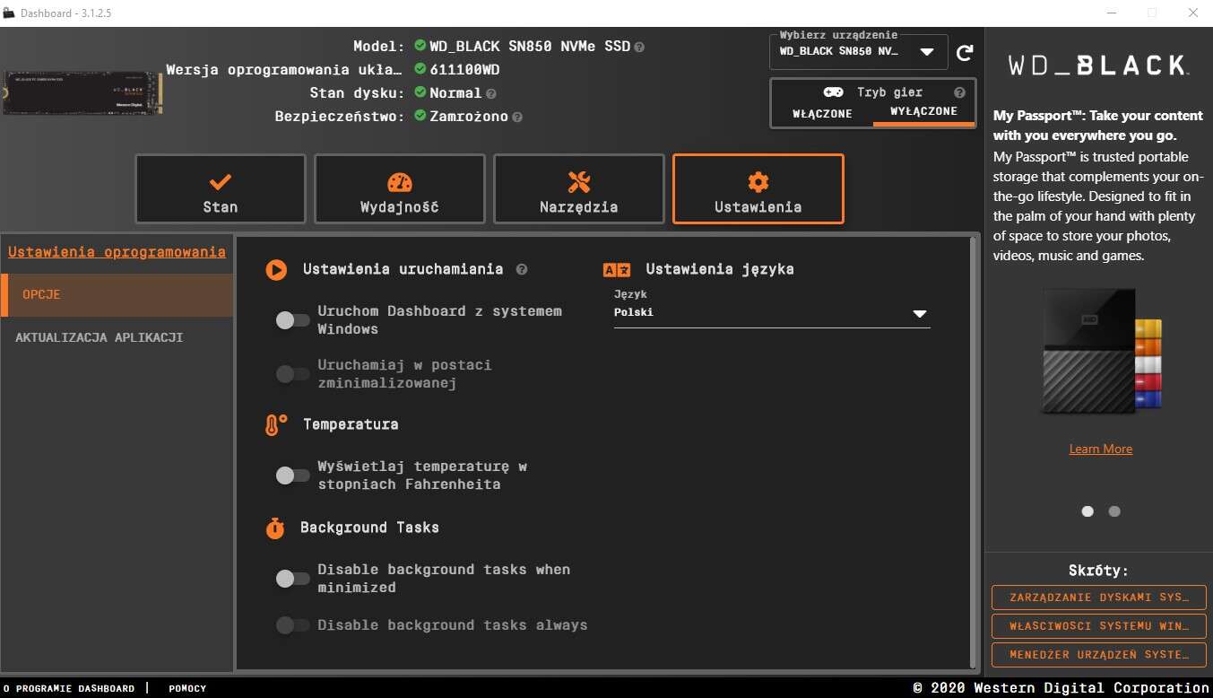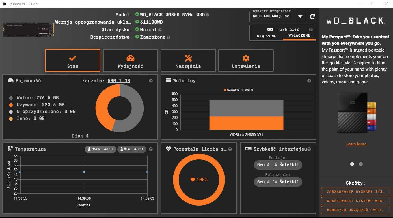 WD Black swoją aplikacją Dashboard wspiera wszystkie dyski producenta, umożliwiając podejrzenie ogólnego stanu dysku, historię jego temperatury i przeprowadzone odczyty/zapisy.