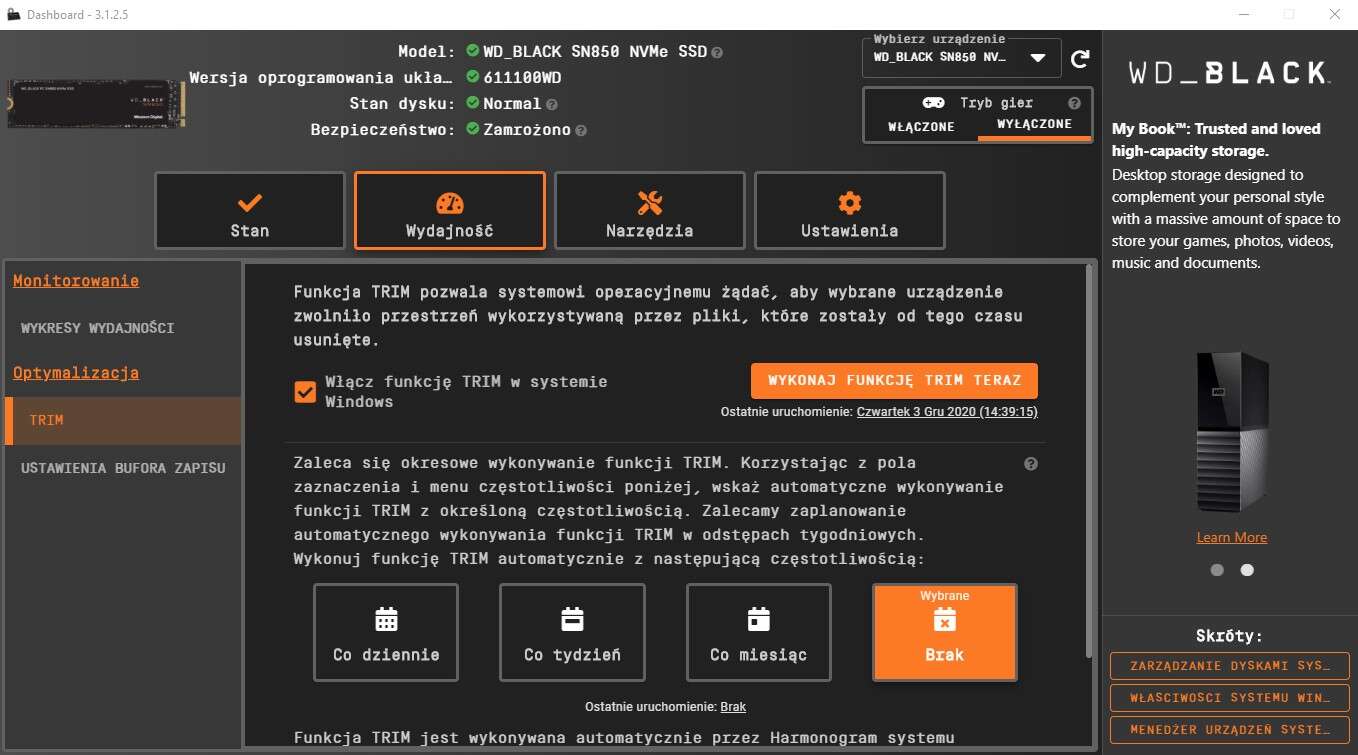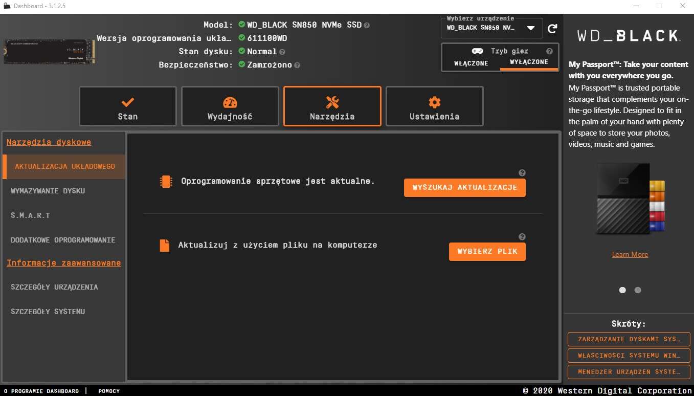 Nie zabrakło też opcji optymalizacji, czy najbardziej przydanych narzędzi. Co ważne, WD Black SN850 pozwala też na uruchomienie dysku w trybie wysokiej wydajności (tryb gier), który jednak nie bierze udziału w naszym teście.