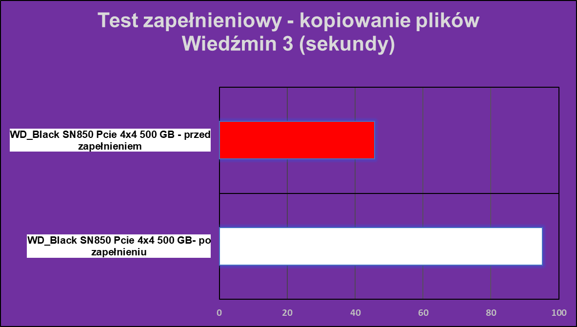Jednak to, czego nie pokazały programy, wykazały jednoznacznie dwa testy w praktyce. Po zapełnieniu kopiowanie plików Wiedźmina 3 trwało ponad dwa razy dłużej, a kopiowanie pliku ISO zabrało ponad 13 sekund więcej.