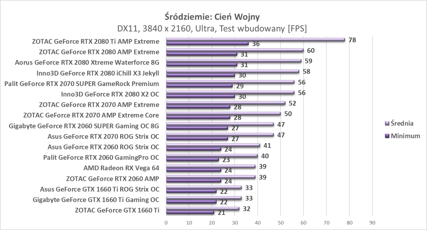 W tej rozdzielczości będzie musieli już częśto obniżać detale w celu uzyskania płynnych 60 fps. Karta jednak ponownie walczy z RTX 2070 w wersji od Asusa. Pokazuje to, że praktycznie w każdej rozdzielczości RTX 2060 SUPER jest w stanie z powodzeniem walczyć z teoretycznie mocniejszym modelem.