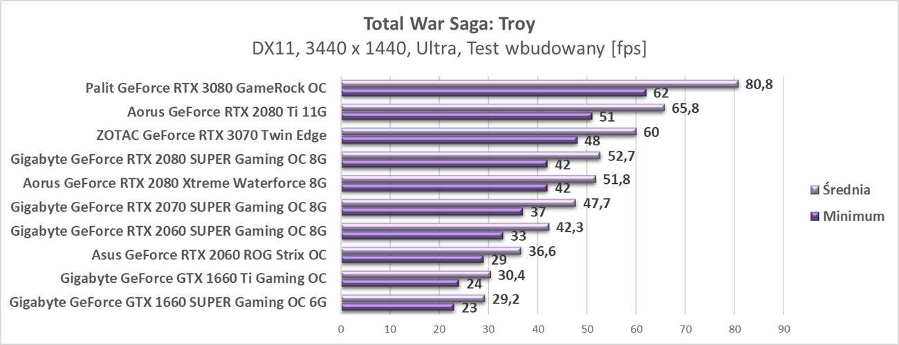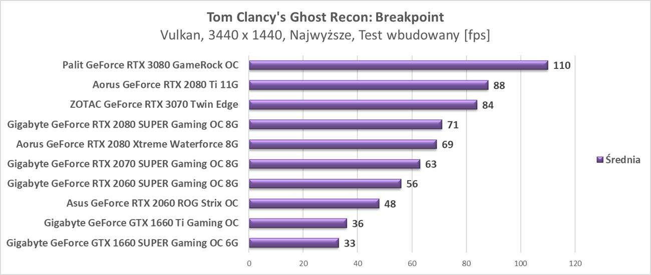 Zacznijmy od najsłabszych grafik – GTX 1660 i 1660 Ti. Niestety one nie radzą sobie zbytnio w UWQHD. Wyniki są poniżej 60 fps (w większości przypadków) i niestety nie ma co liczyć na płynną rozgrywkę. Nie ma tutaj jednak większego zdziwienia – grafiki zostały stworzone pod Full HD, a nie większe rozdzielczości.