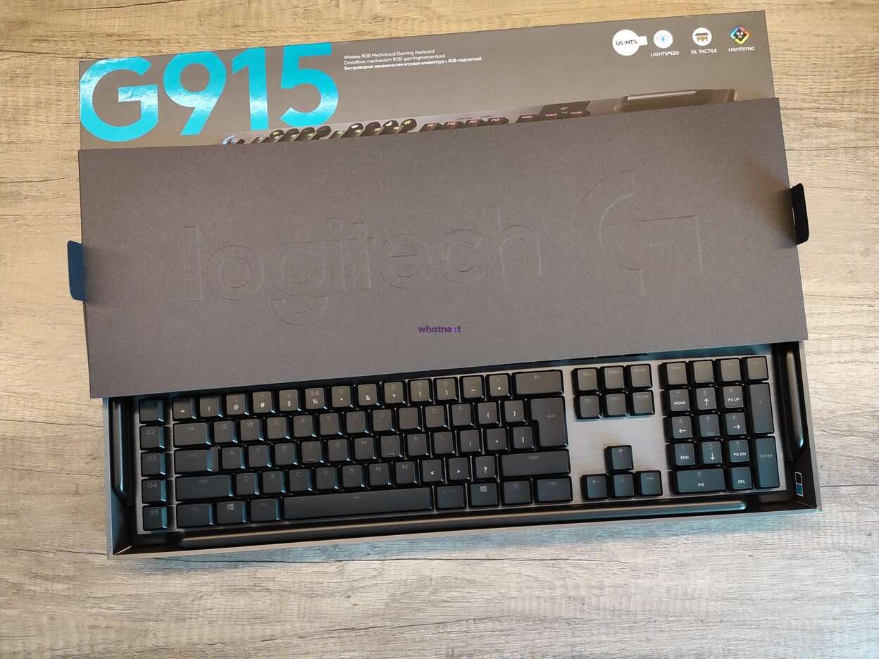 Często zwykłem zachwalać samo opakowanie modeli z tak wysokiej półki cenowej i nie inaczej jest tym razem. G915 skrywa się w solidnym kartonie utrzymanym w stylistyce firmy (szarość połączona z charakterystycznym odcieniem niebieskiego).