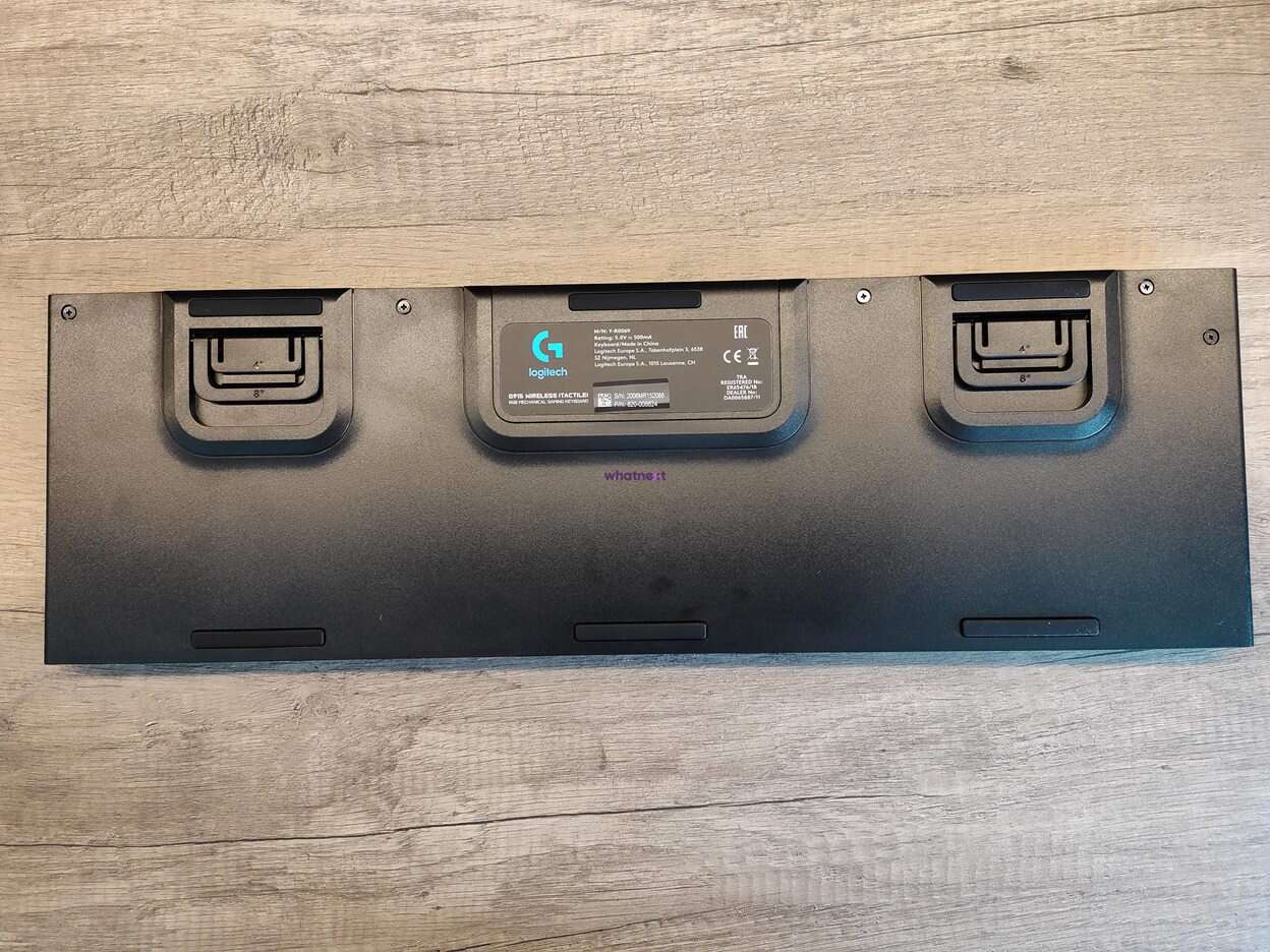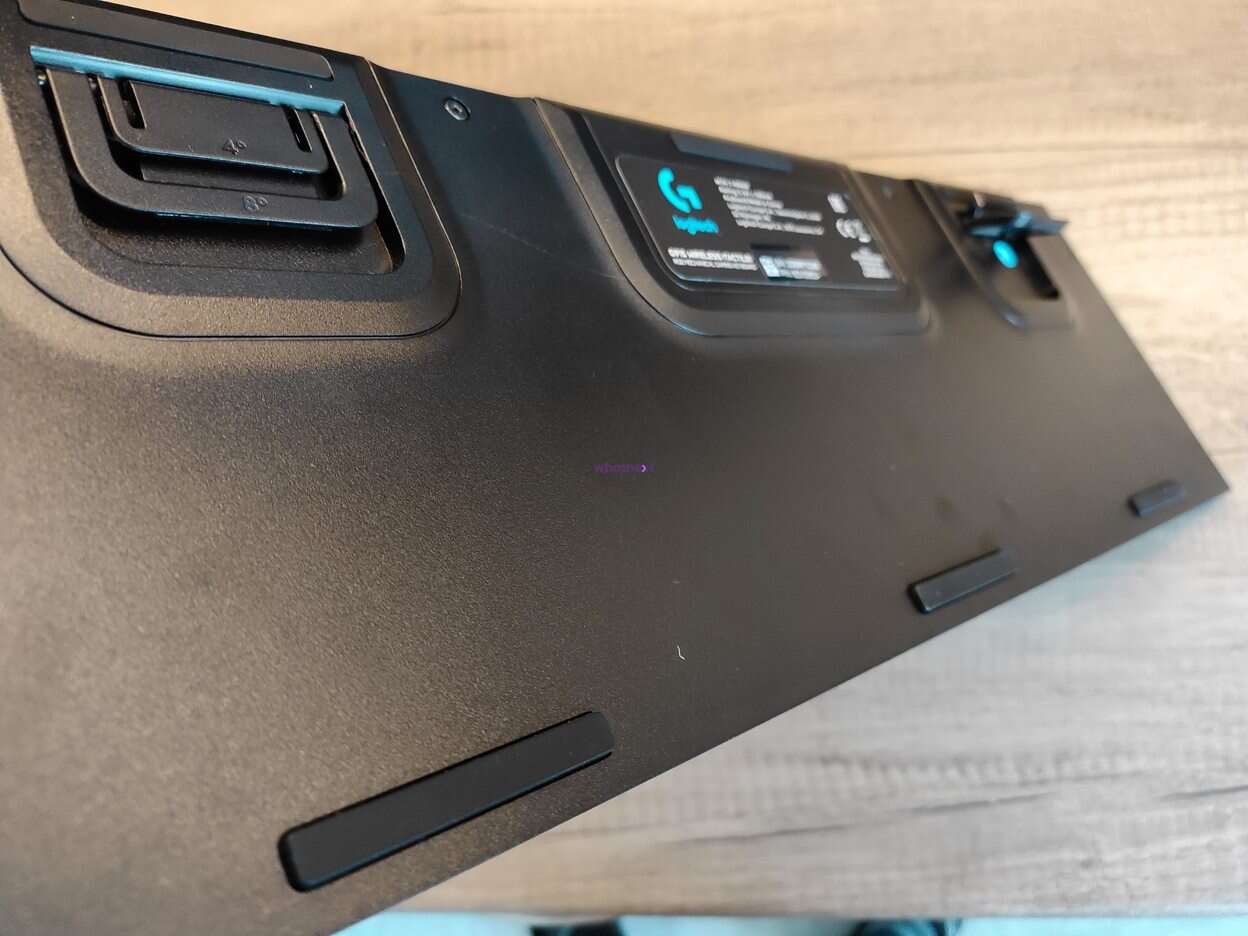 Na spodzie z kolei znajdziemy sześć wielkich antypoślizgowych podkładek w towarzystwie pary nóżek o podwójnej konstrukcji, które umożliwiają nam ustawienie klawiatury pod dwoma kątami. Na tylnej krawędzi z kolei znajdziemy prosty przełącznik on/off oraz złącze microUSB do ładowania.