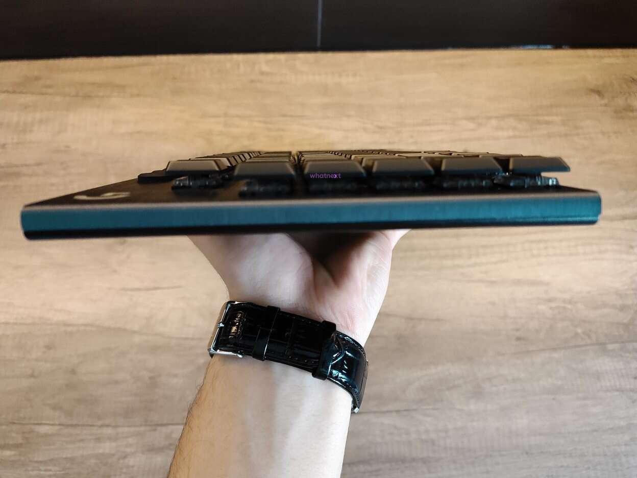 G915 łączy w sobie wiele podejść, które zwykle stronią od siebie na każdym możliwym kroku. Wyróżnia się przede wszystkim swoją prostą obudową, która przyjęła postać „płaskiego” prostopadłościanu o zaokrąglonych bokach. Zwykle bowiem obudowę klawiatur tworzy się „pod kątem”, a więc tak, żeby górna część była nieco wyżej od tej dolnej, co dla niektórych nadaje modelowi nieco więcej ergonomii. W G915 tego zabrakło, co bezpośrednio podsunęło mi powód do narzekania, ale to potem.