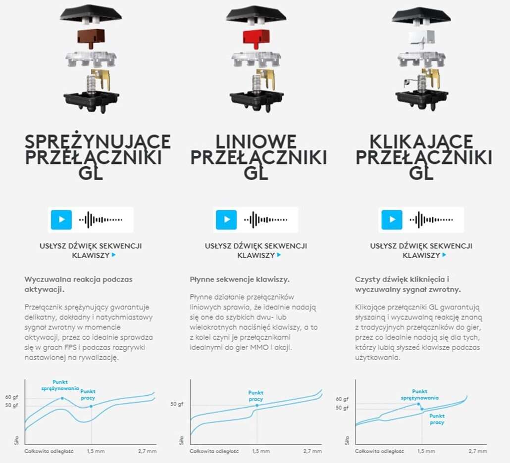 Wybór sprężynujących przełączników GL jest więc dyktowany preferencjami użytkownika. Jeśli ten nie lubi charakterystycznego dla wersji Blue sposobu pracy, ale chce wyczuwać moment aktywacji, te sprężynujące są wskazane. Ich niskoprofilowość, to tradycyjnie kwestia przyzwyczajenia, ale bywalcy laptopów z pewnością nie będą mieli z tym problemów.