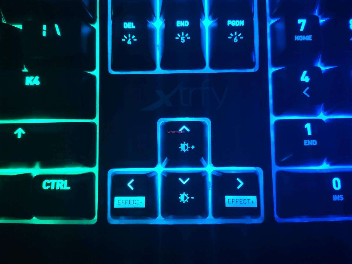 Ogólnie sprawa jest prosta – K4 RGB, jako że już w nazwie wspomina o swoich oświetleniowych możliwościach, sprawdza się świetnie pod kątem efektów RGB. Każda z diod ukrytych pod każdym przyciskiem jest jasna, bardzo dobrze odwzorowuje ustalone z góry kolory, a na dodatek rozlewa się na wyciętej czcionce perfekcyjnie, oświetlając nawet drobne szczegóły.