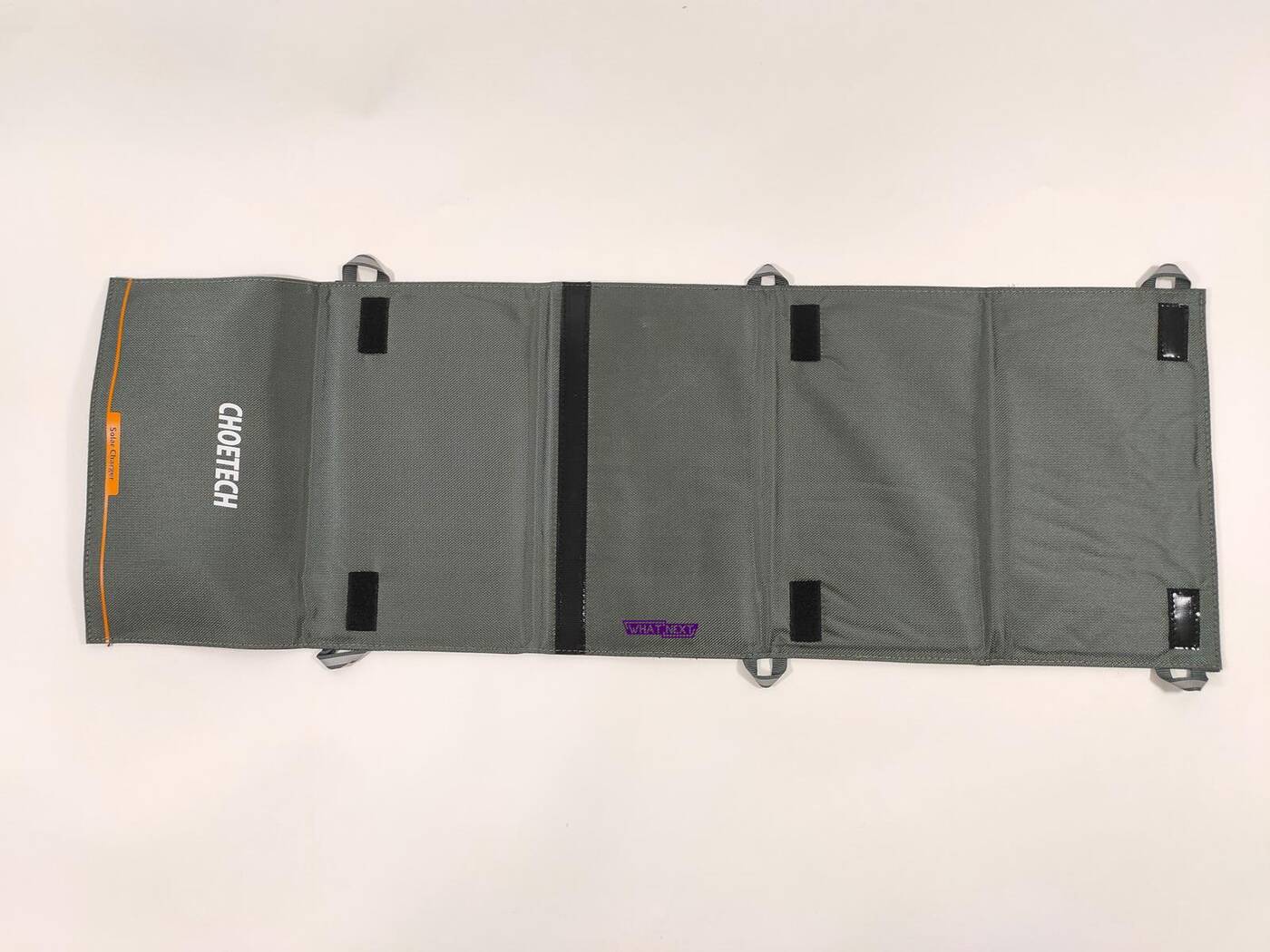 Choetech 24W Solar Charger jest dosyć gruby po złożeniu. Jednakże dzięki kształtowi małego zeszytu można go łatwo przenosić. Wymiary po złożeniu to 260 mm x 160 mm x 40 mm, a po rozłożeniu 790 mm x 260 mm 20 mm. Jak sami widzicie, jest to bardzo długie urządzenie – zostało to wymuszone obecnością czterech dużych paneli słonecznych. W piątej części ładowarki znajdują się wyjścia USB oraz miejsce na kable. Warto od razu zaznaczyć, że składanie i rozkładanie jest bardzo proste.