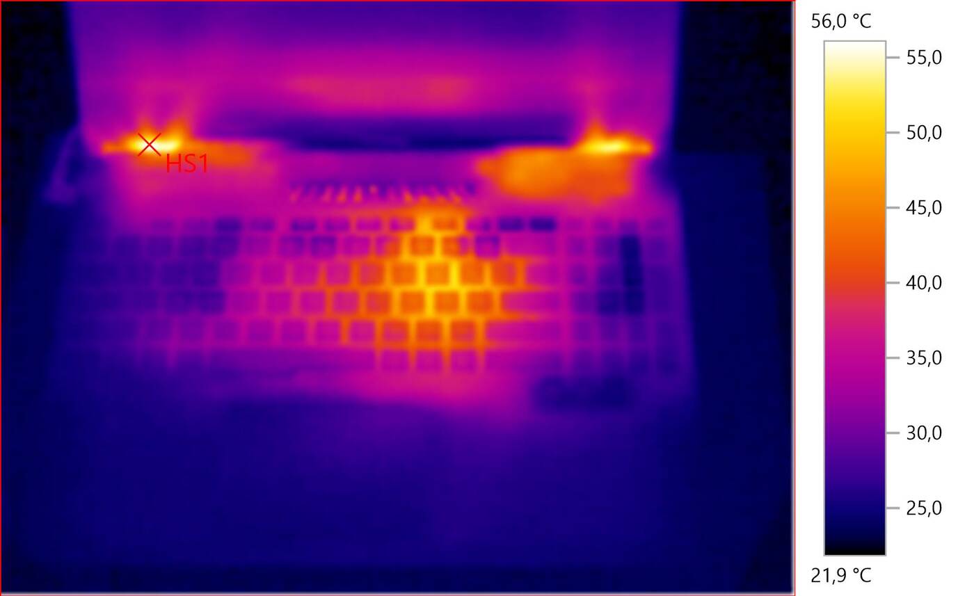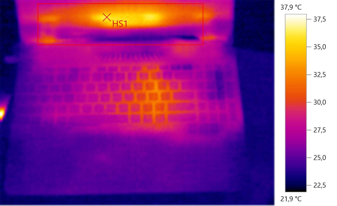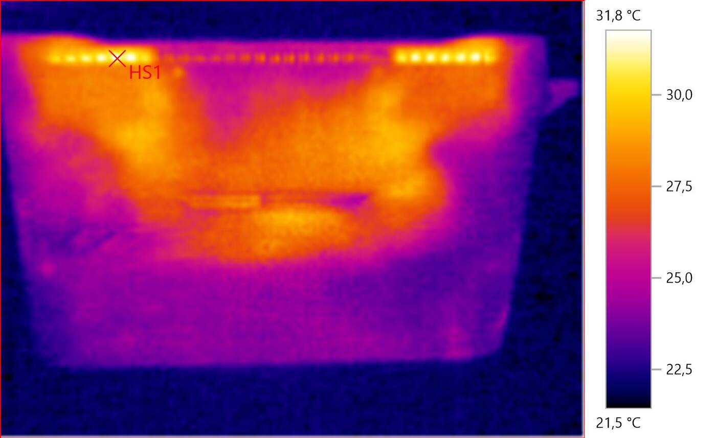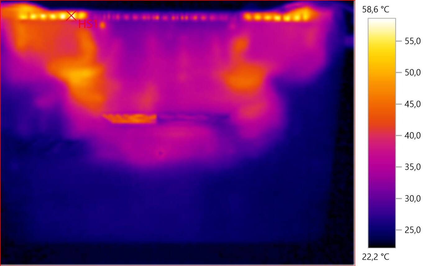 Czasy pracy na baterii są raczej krótkie. W spoczynku jeszcze daje radę, ale pod obciążeniem jest bardzo słabo – w pociągu raczej zbyt długo go nie poużywacie. Same temperatury w spoczynku są niskie, ale pod obciążeniem bardzo wysokie. Zdjęcia termowizyjne pokazują, że najcieplej jest pod obciążeniem przy wylocie powietrza – do prawie 60°C.
