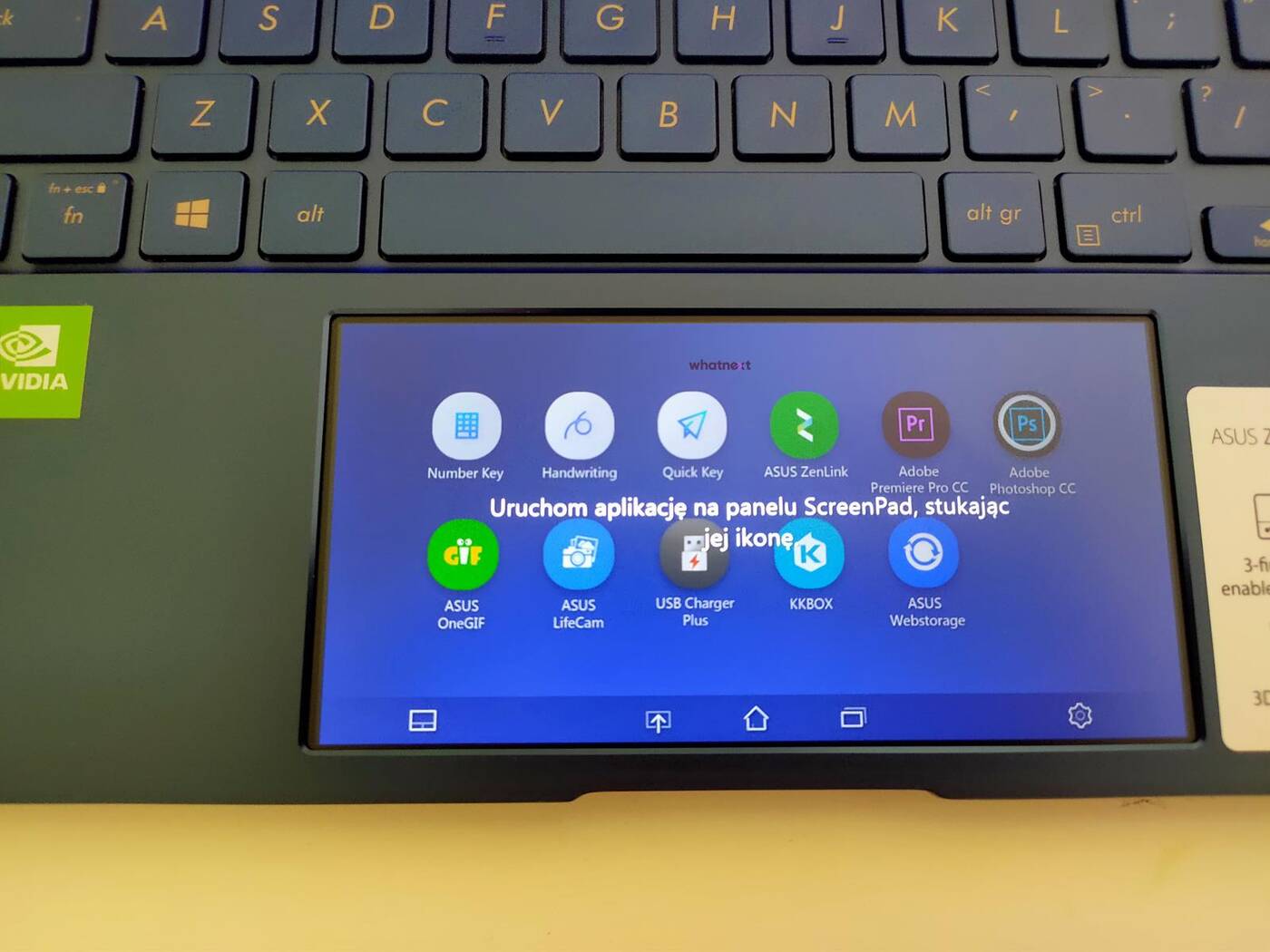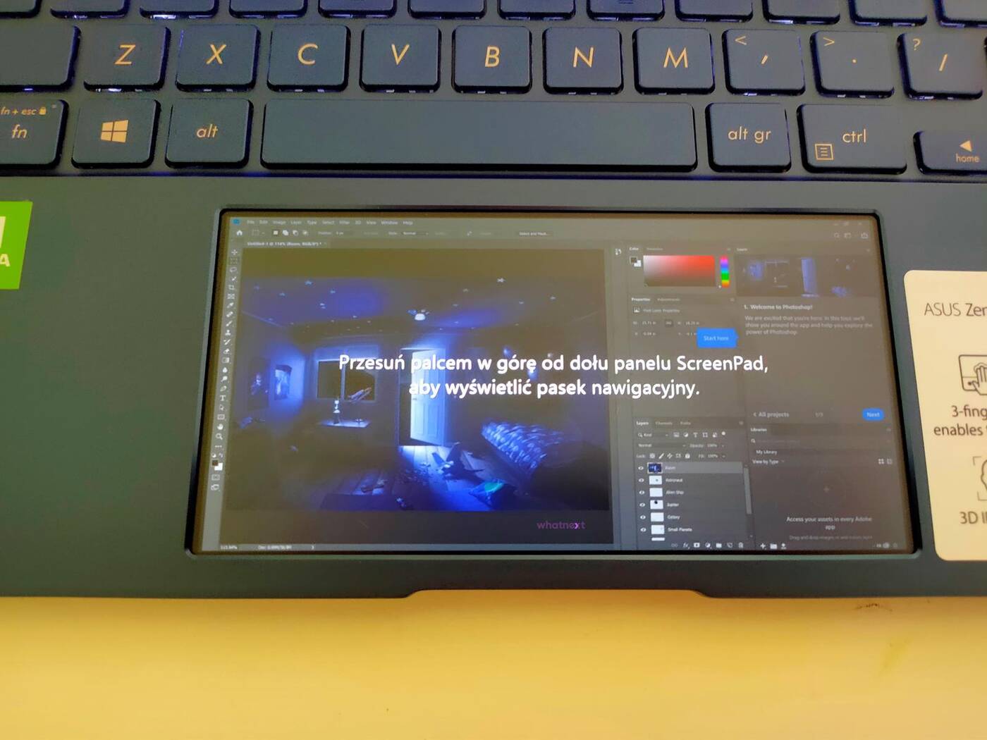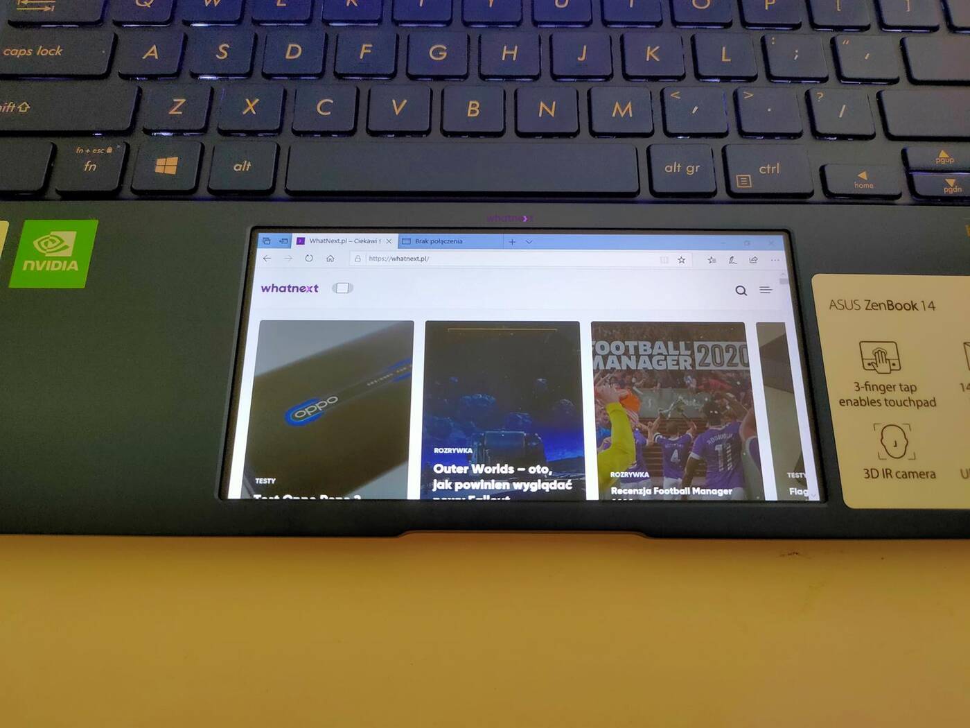 Spodziewałem się przy tym, że korzystanie ze ScreenPad 2.0 jako z gładzika będzie słabe. Okazało się jednak, że jest to dalej wygodne rozwiązanie. Palec porusza się płynnie, nie przycina się i korzystanie z touchpada jest bardzo wygodne. Jest też on bardzo duży, co dodatkowo ułatwia nawigację. Asus świetnie rozwiązał tę kwestię i genialnie wykorzystał dodatkową przestrzeń.