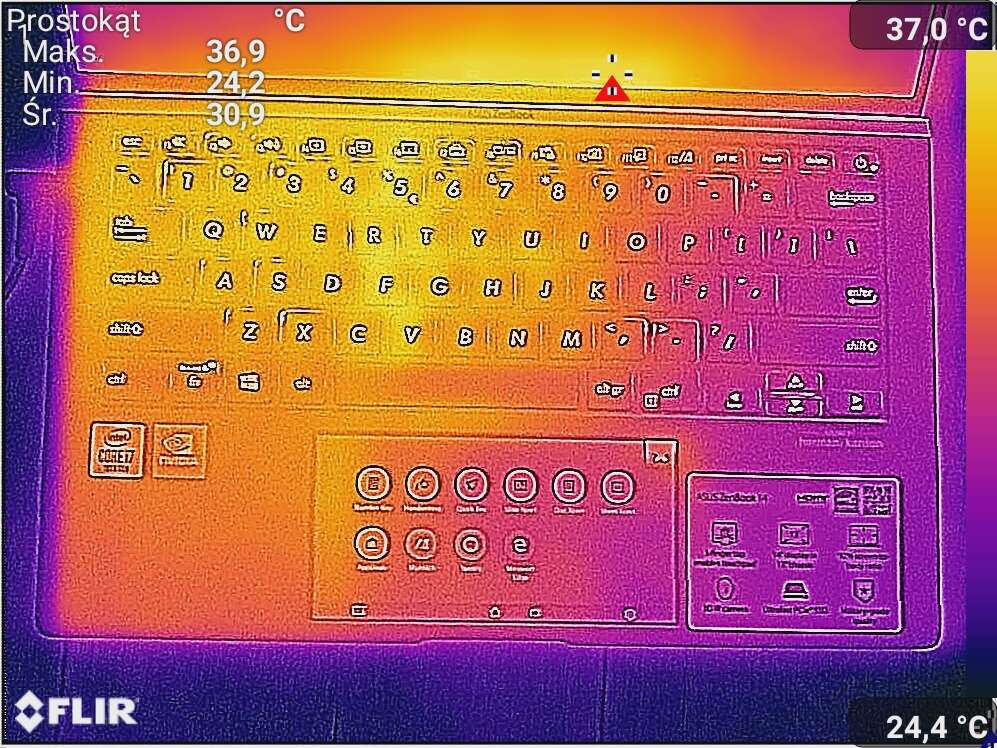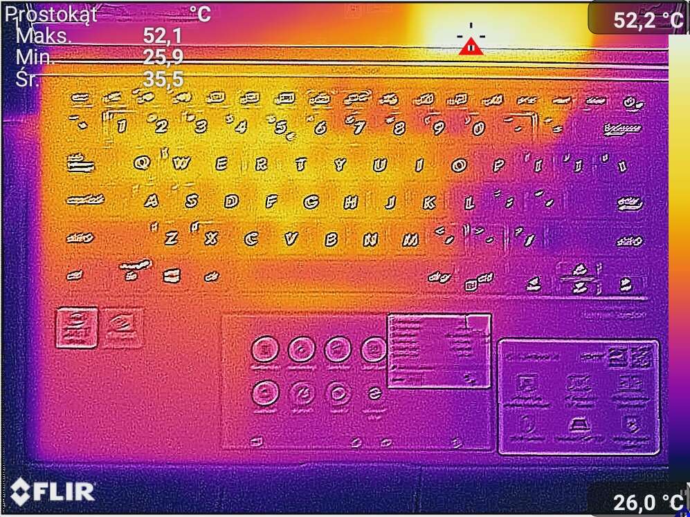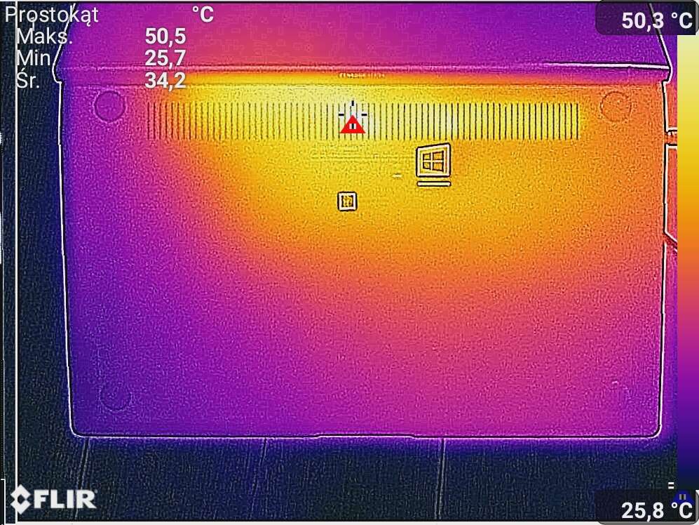 W testach temperatury wykorzystałem moduł termowizyjny smartfonu CAT S61. W spoczynku jest idealna cisza oraz temperatury są naprawdę niskie. Ta sytuacja jest także zachowana pod obciążeniem – laptop wcale nie jest głośny a temperatury zaskakują – są dalej stosunkowo niskie. Największa temperatura laptopa jest zgodnie z oczekiwaniami na wylocie powietrza – nie ma mowy o nagrzewającej się konstrukcji. Niestety jest to spowodowane mocnym throttlingiem procesora, o czym za chwilę.