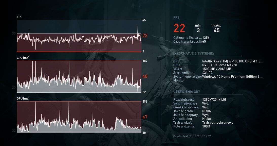 Z ciekawości sprawdziłem, czy na ASUS ZenBook 14 UX434F będzie można pograć w nowsze tytuły. Oczywiście mowa tutaj o bardziej wymagających grach, a nie produkcjach typu League of Legends czy CS:GO, które pójdą bez problemów. Każda z poniższych gier odpalona została w rozdzielczości 1280 x 720 px i przy najniższych możliwych detalach.