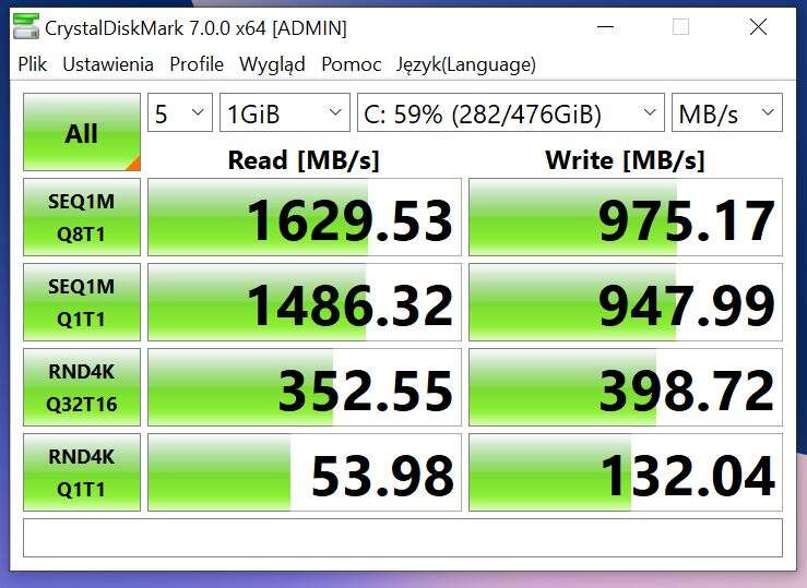 Taktowanie procesora pod obciążeniem spada do ok. 1300 MHz – throttling jest ogromny. Po ok. 10 minucie włączyłem CrystalDiskmark i wtedy taktowanie spadło nawet poniżej 1 GHz. W takich warunkach nie ma mowy o wydajności i od razu wiadomo, jak została osiągnięta w miarę cicha praca oraz niskie temperatury pod obciążeniem.