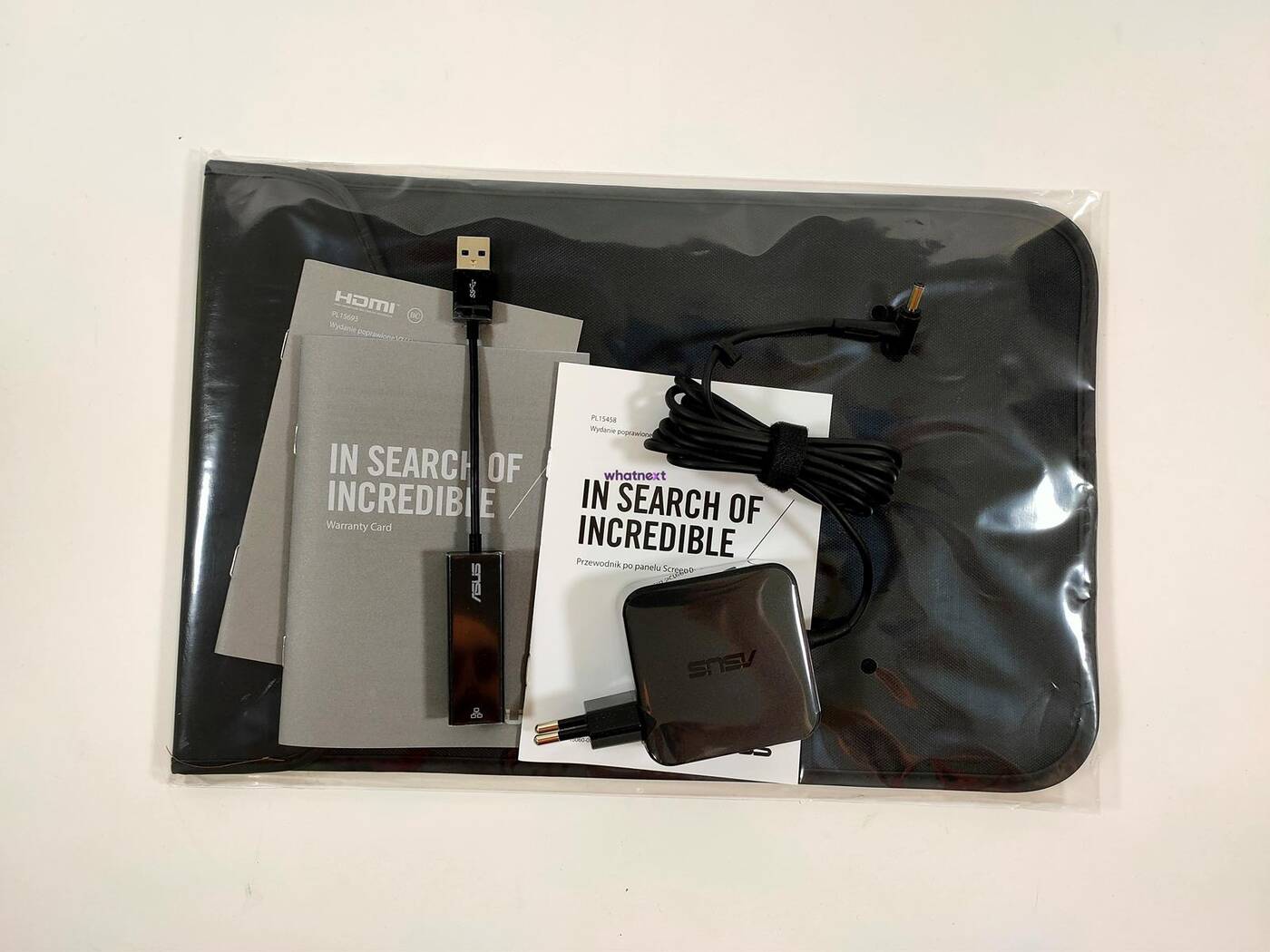 Laptop zapakowany został w szary karton. Wraz z nim otrzymujemy etui, 65 W zasilacz, instrukcję oraz przejściówkę USB->Ethernet. Miłym dodatkiem jest etui. Dzięki niemu bezpiecznie przeniesiemy sprzęt nawet w plecaku. Przejściówka przyda się, jeśli chcecie podłączyć internet przez kabel RJ-45.