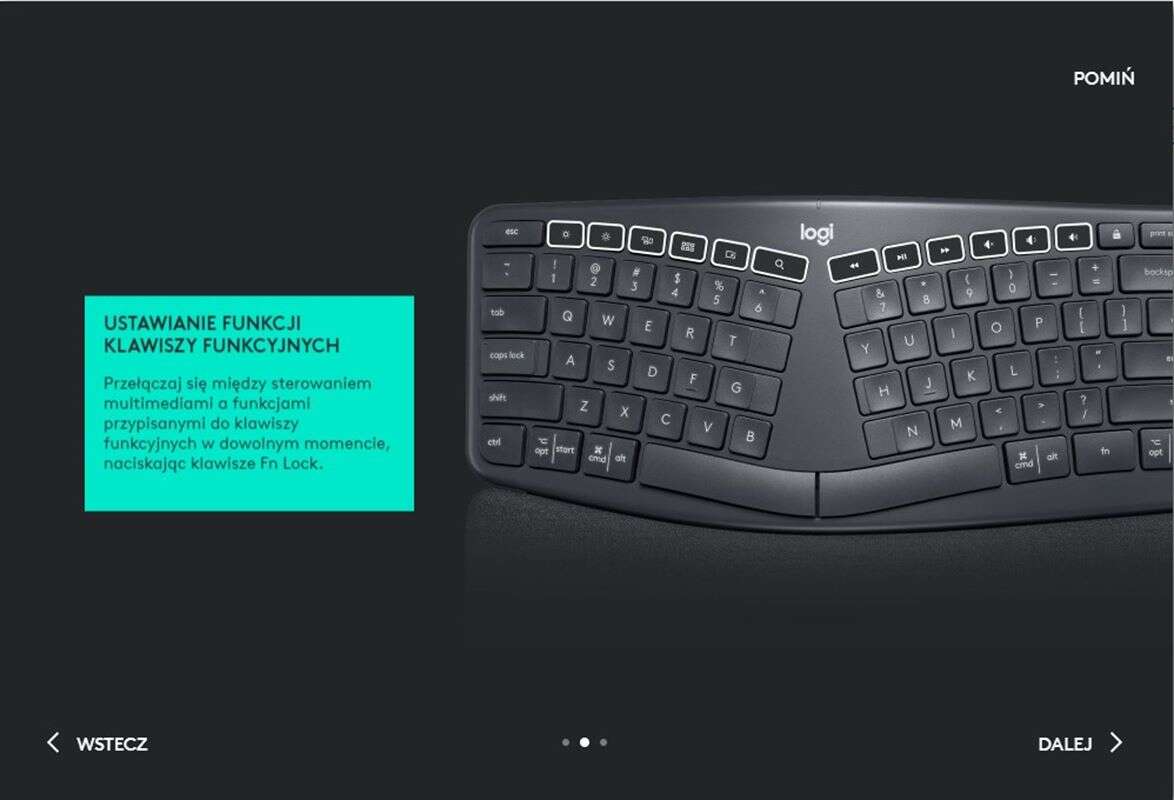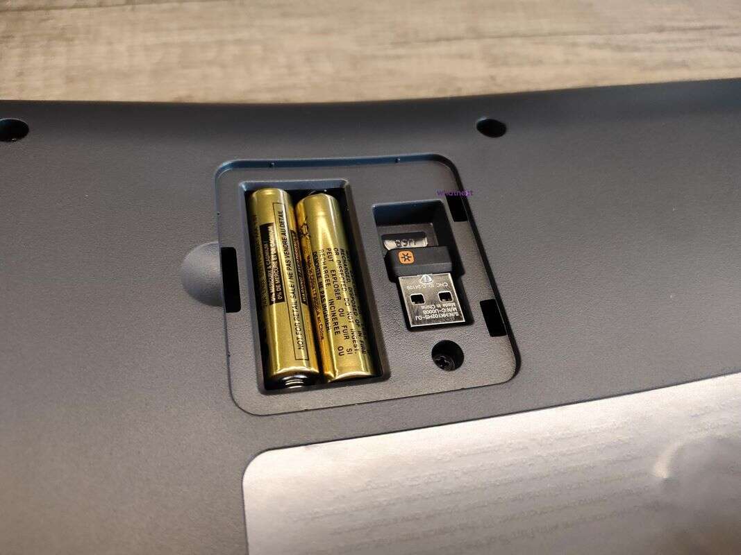 Zważywszy na działalność firmy, uznaję to za przejaw jej dbałości o środowisko, a nie oszczędność. W klawiaturze znajdziemy preinstalowane już dwie baterie AAA, instrukcję obsługi oraz odbiornik USB Unifying pracujący na częstotliwości 2,4 GHz. Warto jednak od razu zauważyć, że Ergo K860 posiada również łączność Bluetooth 5.0 Low Energy, umożliwiając łączność z każdym urządzeniem (nawet mobilnym) o ile ten wspiera standard Keyboard HID.