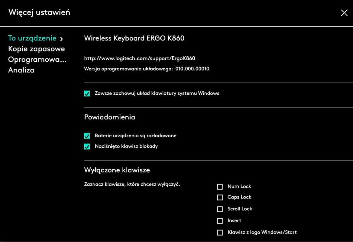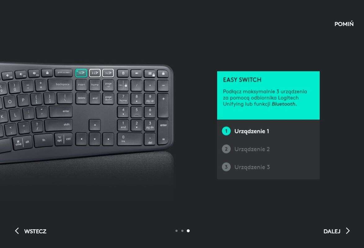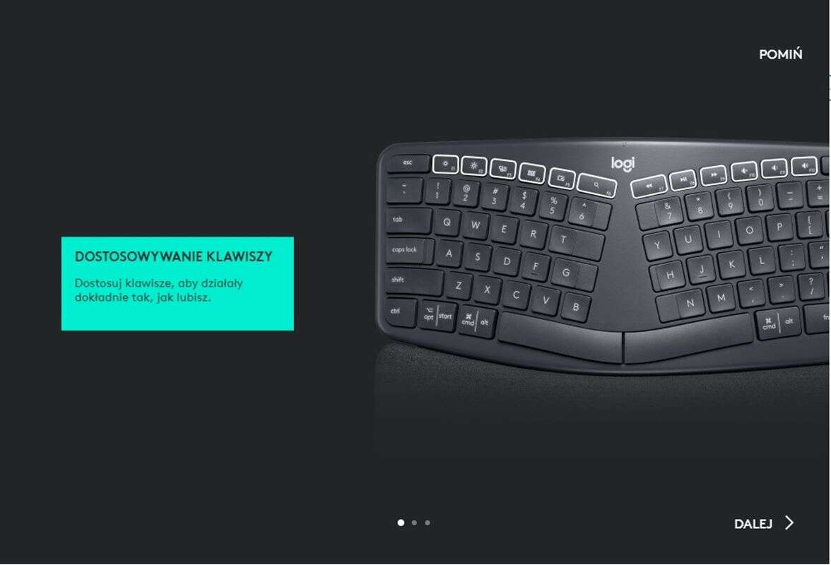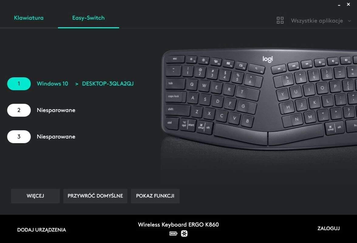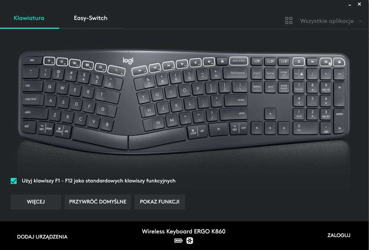 Wspomaga go oprogramowanie Logitech Options do pobrania ze strony producenta, w którym zabawimy się podmienianiem z bogatego zaplecza funkcji klawiszy funkcyjnych (te są ukryte pod F1-F12 i nie tylko) i skonfigurujemy wspomniane przełączanie się między sprzętami w ramach funkcji Easy Switch. Dodatkowo podglądniemy w nim stan naładowania baterii.