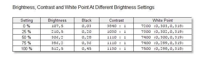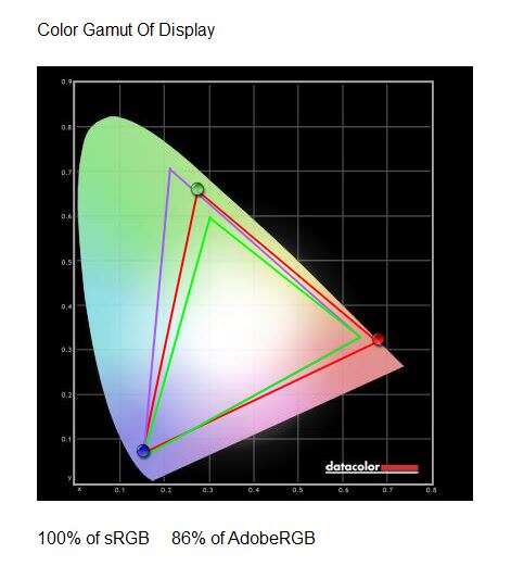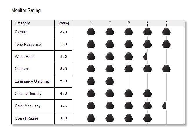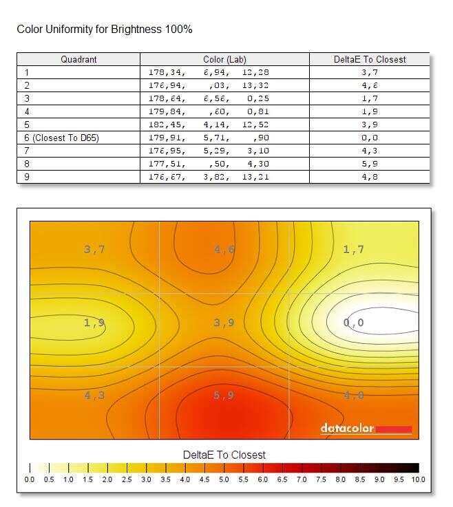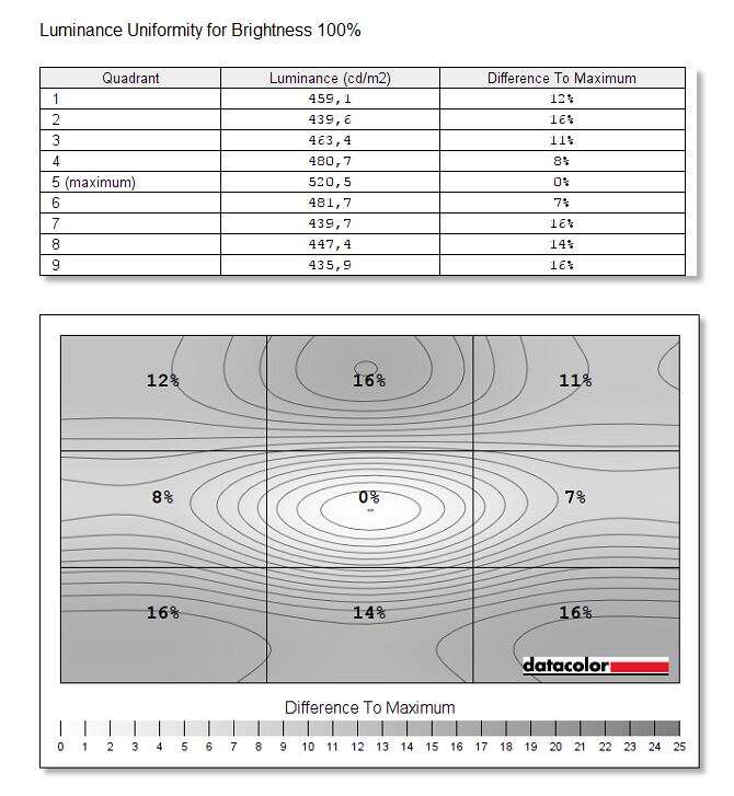 Wyniki testów pokazują pokrycie sRGB równe 100%, ale po zerknięciu na wykres widać, że rzeczywiście jest ono większe. Pokrycie AdobeRGB wynosi 86% – są to świetne wyniki. Gamma jest idealna i wynosi 2,2. Zmierzony kontrast to 1110:1 – również bardzo duży. Zawodzi niestety punk bieli, który jest równy ok. 7400K. Niejednorodność kolorów jest dobra – maksymalna różnica to 5,9. Gorzej jest z niejednorodnością podświetlenia – góra i dół znacząco różnią się od środka. Maksymalna zmierzona jasność jest równa 520,5 cd/m^2. Jest to wynik mniejszy od deklarowanego, ale najlepszy wśród monitorów, jakie do tej pory testowałem.