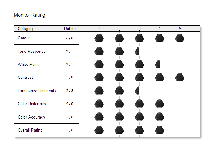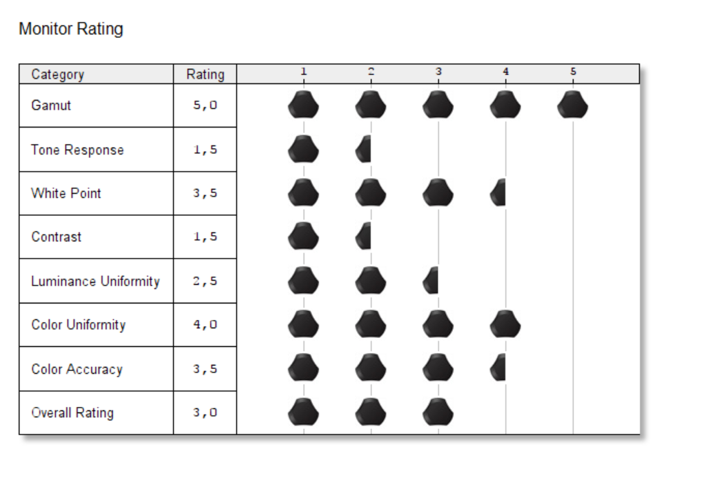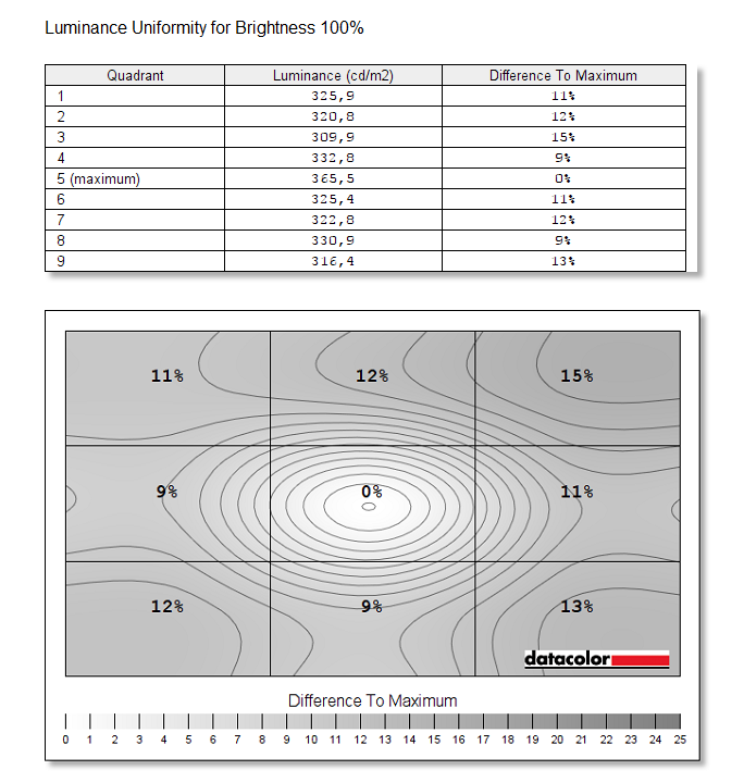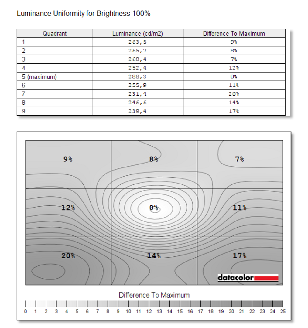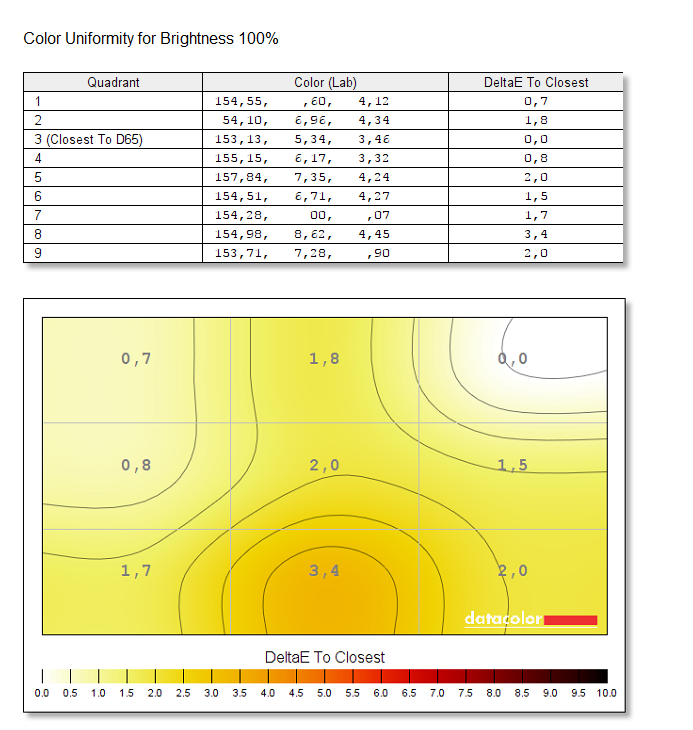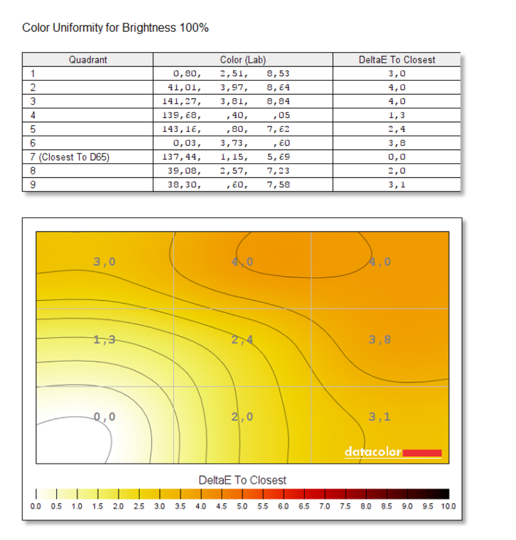 Pokrycie kolorów wynosi 100% dla sRGB i 85% dla AdobeRGB. Jest to świetny wynik, jeden z najlepszych, jakich miałem. Zmierzona gamma to 2,0 więc trochę odstaje od idealne 2,2. Kontrast wynosi 1030:1 i muszę przyznać, że jest naprawdę niezły. Punkt bieli także jest bliski ideałowi. Niejednorodność kolorów oceniam też pozytywnie, jednakże trochę gorzej jest z podświetleniem. 15% to maksymalna różnica i może to być już zauważalne. Za to maksymalna jasność wynosi 365,5 cd/m^2. Dokładność kolorów też nie jest zła – są widoczne różnice, ale w końcu nie jest to IPS, żeby wymagać ideałów. Kąty widzenia także są niezłe. Podsumowując jest to nawet niezła konstrukcja, która ma swoje wady ale też zalety.