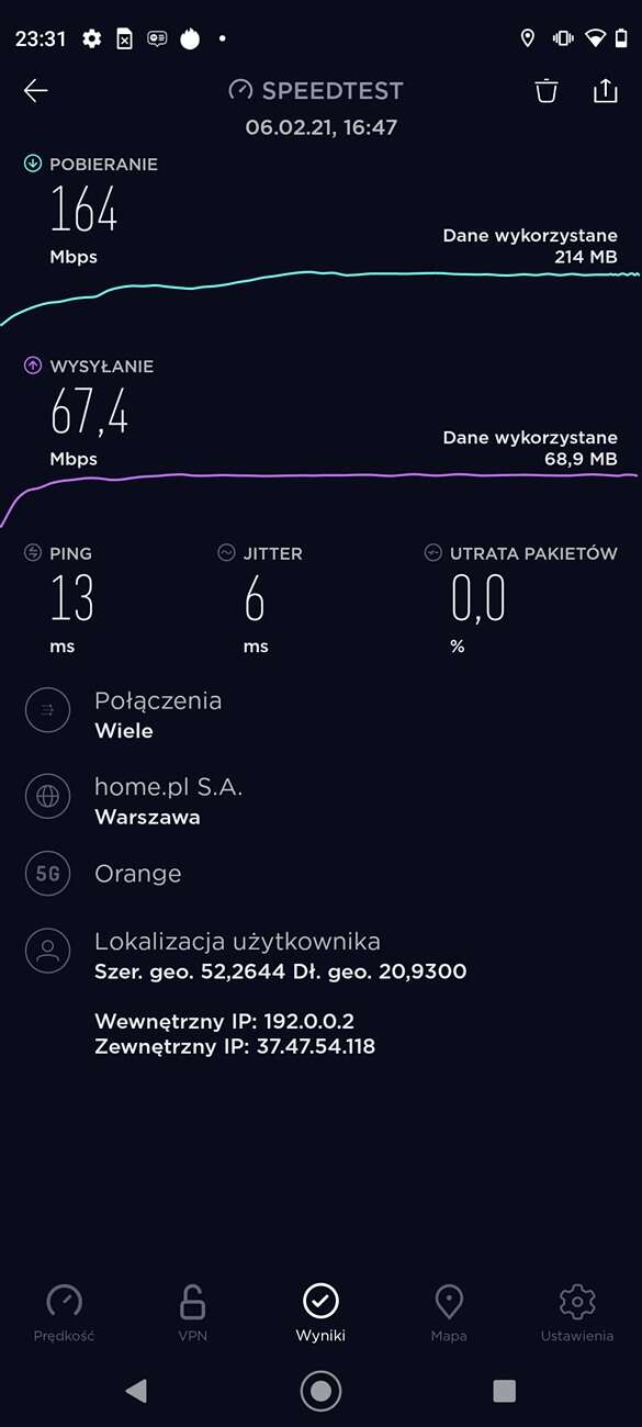 Niewątpliwie największą zaletą Moto G 5G jest obsługa sieci 5G i to również w paśmie 2600 MHz. Nie bez powodu smartfon został włączony do oferty sieci Plus. Oczywiście 5G śmiga również we wszystkich pozostałych sieciach. Dla przykładu w Orange w Warszawie prędkości uzyskane przeze mnie wyglądały następująco: 164 Mb/s pobieranie i 67,4 Mb/s wysyłanie danych. Całkiem nieźle! Screen z programu Speedtest możecie zobaczyć powyżej. Oczywiście telefon obsługuje również Wi-Fi w paśmie 2,4 i 5 GHz. Slot dual-SIM jest niestety hybrydowy… Tak więc wkładając kartę pamięci mówimy papa drugiej karcie nanoSIM.