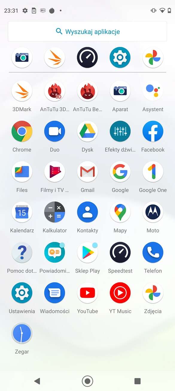 Smartfon działa pod kontrolą praktycznie czystego Androida 10 z poprawkami bezpieczeństwa z listopada tego roku. Jak widać producent nie rozpieszcza tego modelu aktualizacjami. Motorola dodała tu zaledwie dwie swoje aplikacje, kilka opcji w menu i dedykowany przycisk do Asystenta Google na obudowie. Jest zatem czytelnie, prosto i podstawowo. Znajdziemy tu dość rozbudowaną obsługę gestów ale na autorskie aplikacje do obsługi multimediów i optymalizacji urządzenia nie mamy co liczyć.