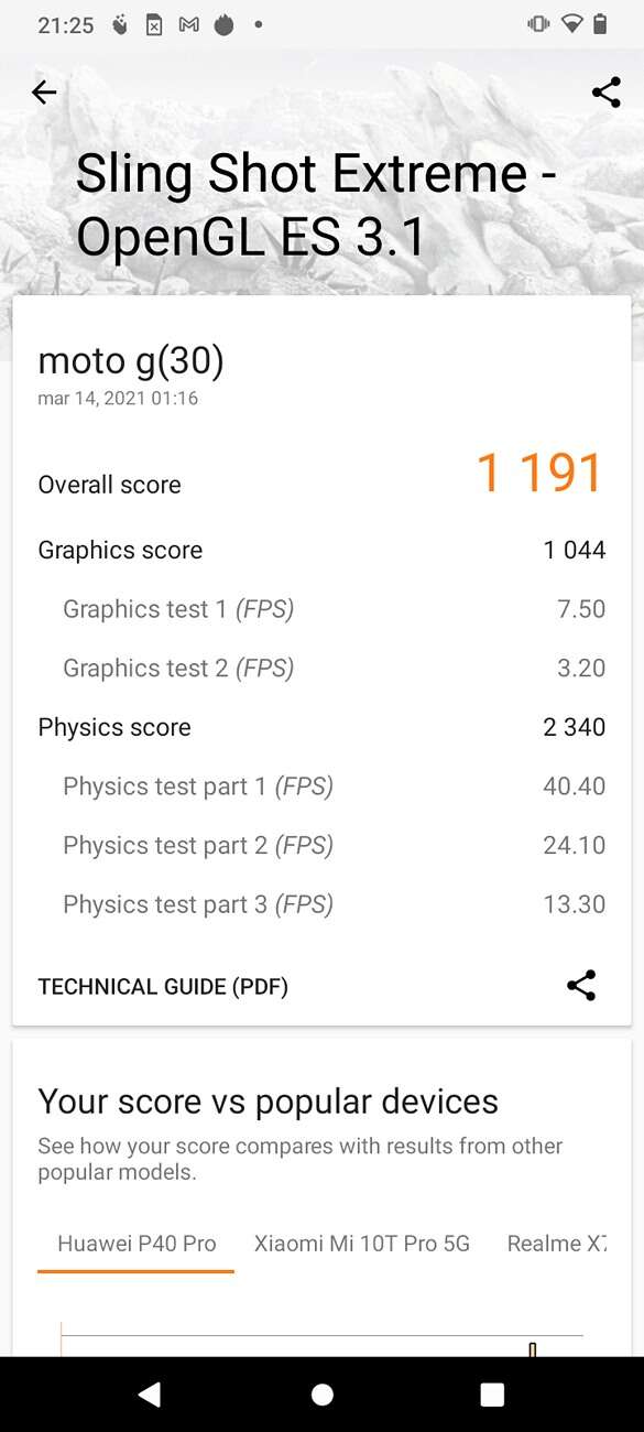 Tutaj znowu będę posiłkował się przykładem konkurencyjnego smartfona wymienionego chwilę wcześniej. Realme 7 – 322 tys. pkt w Antutu, natomiast Motorola Moto G30 – 180 tys. Szach – mat. Wyniki w kolejnych testach możecie zobaczyć poniżej.