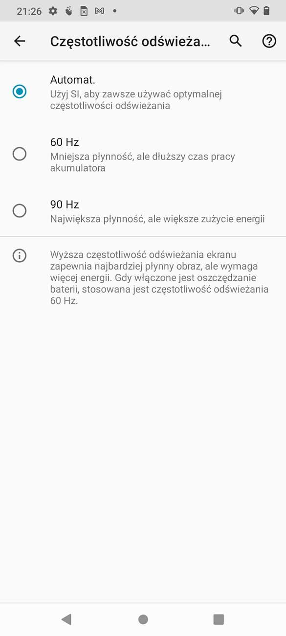 W ustawieniach znajdziemy filtr światła niebieskiego, tryb ciemny dla menu oraz możliwość podstawowej regulacji stopnia nasycenia barw. Możemy również przełączać się pomiędzy 60 Hz a 90 Hz odświeżaniem ekranu.