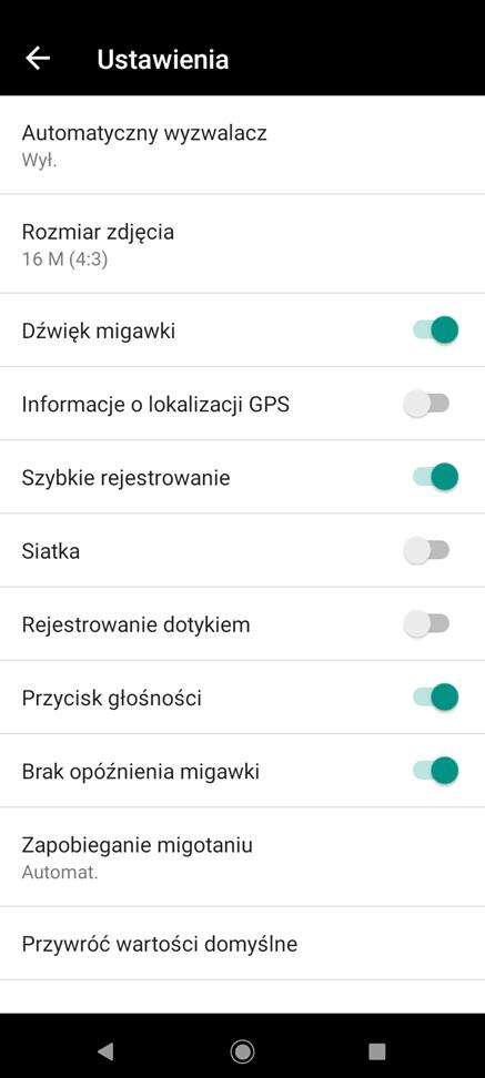 Poniżej z kolei zobaczycie, jak prezentują się ustawienia, w których możemy wybrać maksymalnie 16 Mpx zdjęcie w formacie 4:3 i film w Full HD oraz 30 FPS. Pod kątem oprogramowania jest słabo, bo możemy liczyć tylko na tryb HDR, portret i panoramę, a o zwolnionym tempie i innych wodotryskach już nie. Nie jest to jednak problem, a sprowadzenie wszystkiego do tego, co najważniejsze.