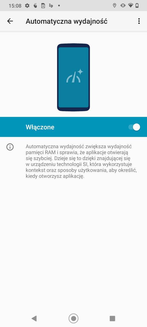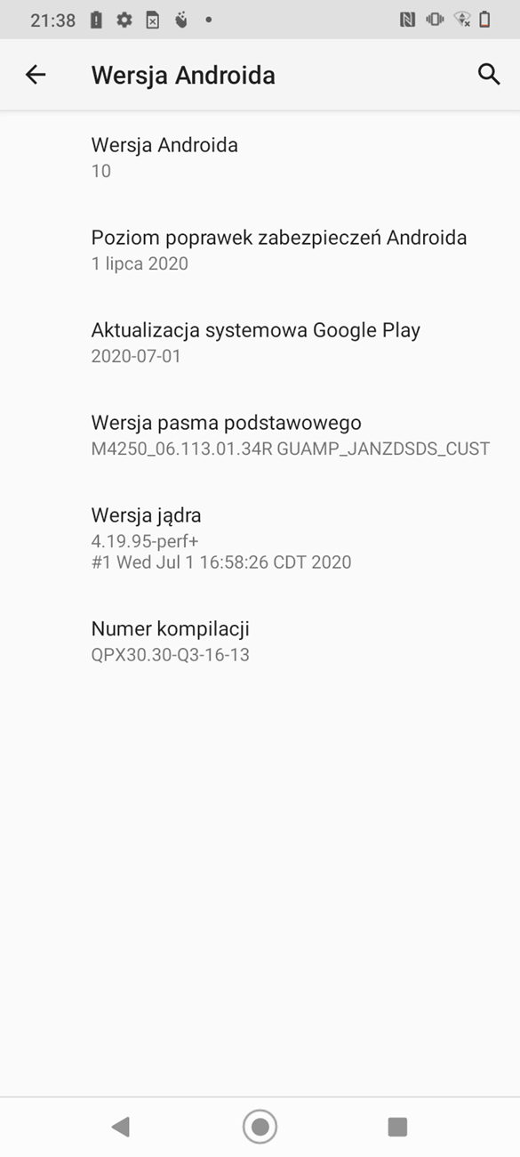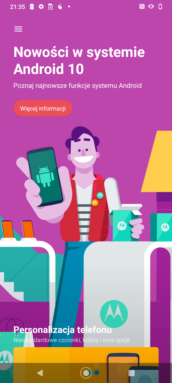 Smartfon działa pod kontrolą praktycznie czystego Androida 10 z poprawkami bezpieczeństwa z lipca tego roku. Motorola dodała tu tylko jedną swoją aplikację, kilka opcji w menu i dedykowany przycisk do Asystenta Google na obudowie. Jest więc czytelnie, prosto i podstawowo. Z ważniejszych funkcji można wymienić tryb ciemny dla menu i podstawową obsługę gestów. O autorskich aplikacjach do obsługi multimediów i optymalizacji urządzenia możemy co najwyżej pomarzyć.