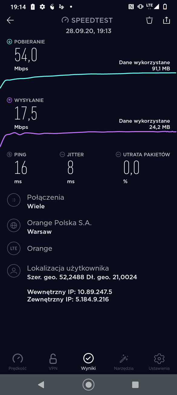 Smartfon jest hybrydowym Dual-SIMem, obsługuje Wi-Fi w paśmie zarówno 2,4 GHz, jak i 5 GHz oraz oczywiście LTE. Jej prędkość w programie Speedtest w sieci Orange pod Warszawą wygląda następująco: 54 Mb/s pobieranie i 17,5 Mb/s w przypadku wysyłania danych. Szału więc nie ma. Oczywiście na obsługę sieci 5G w tej cenie liczyć jeszcze nie możemy.