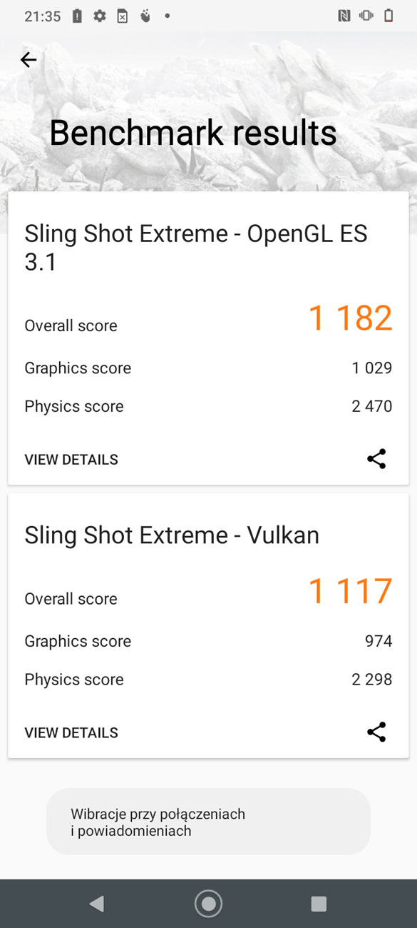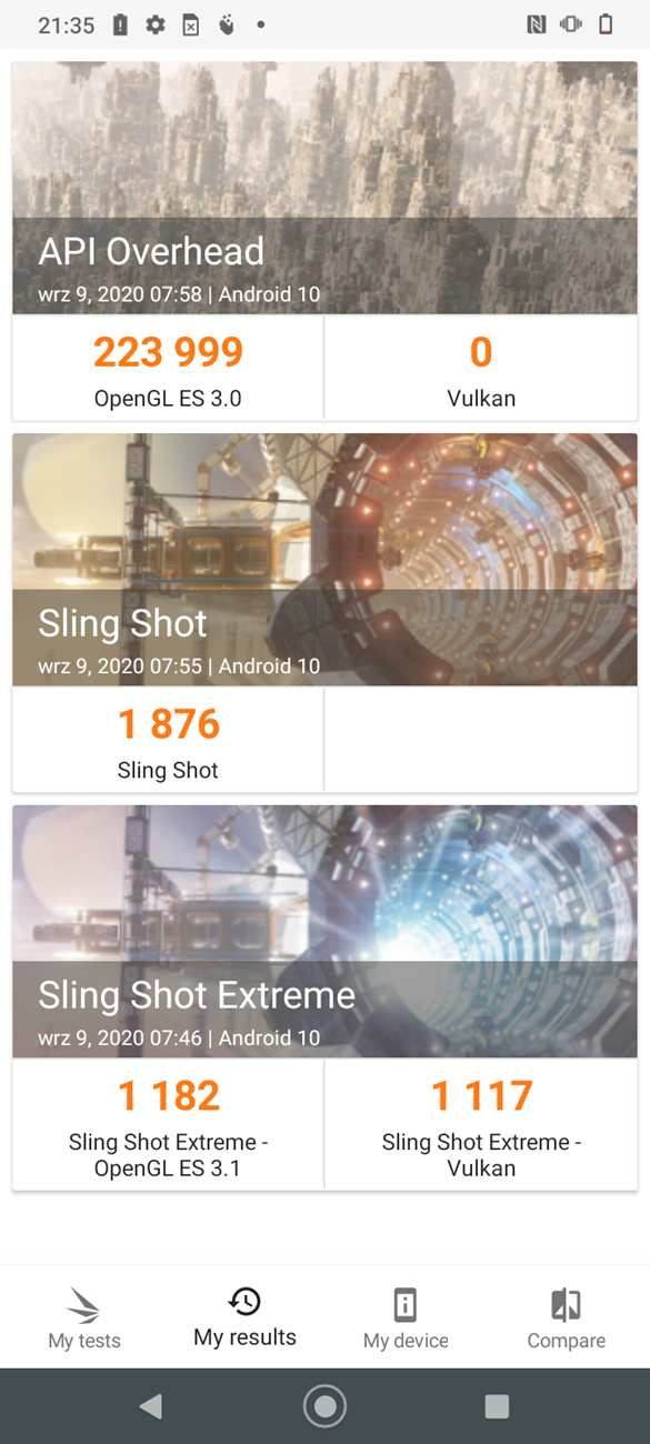 - 3D Mark (test Sling Shot Extreme) – 1182 pkt (OpenGL ES 3.1), 1117 pkt (Vulkan)