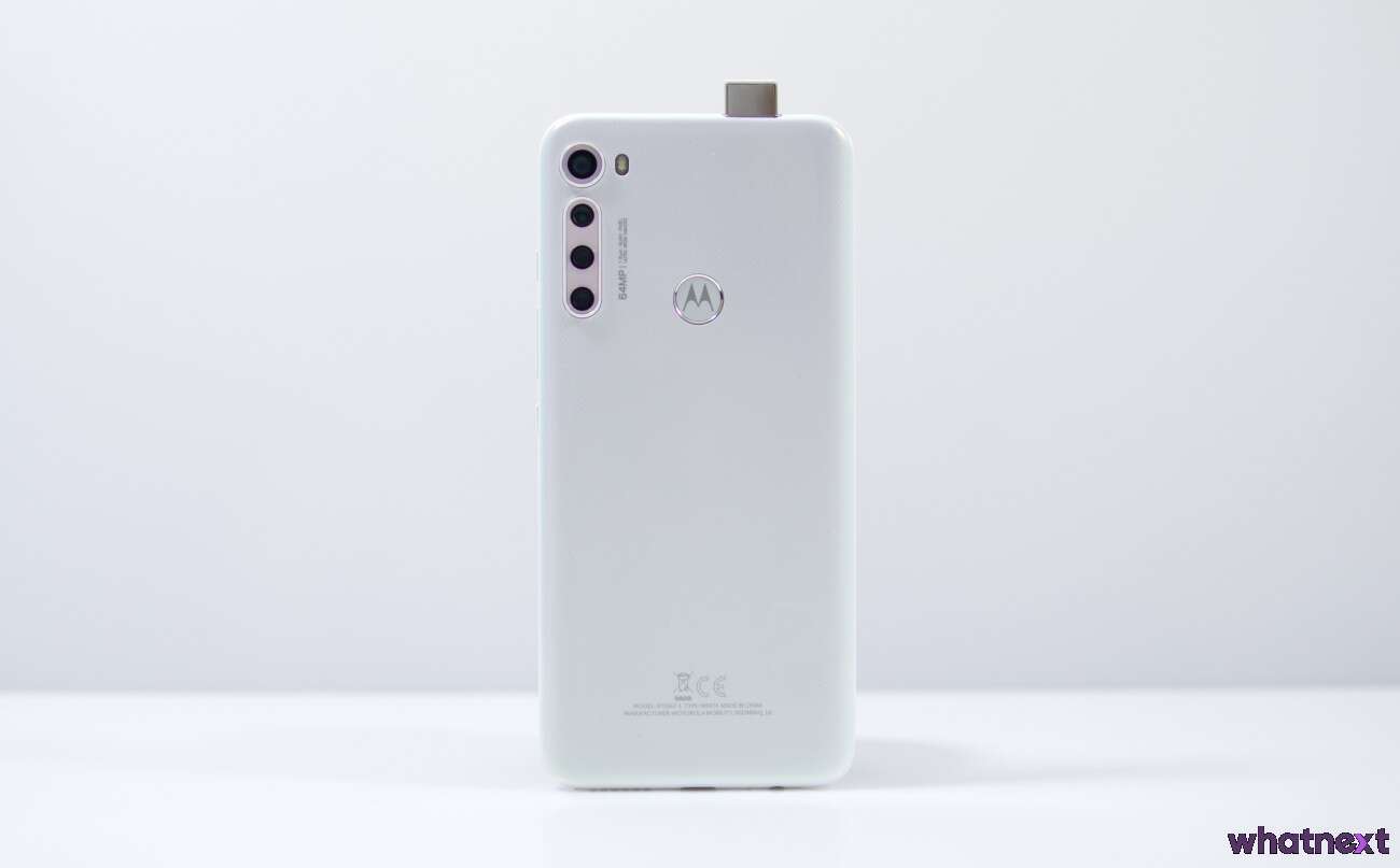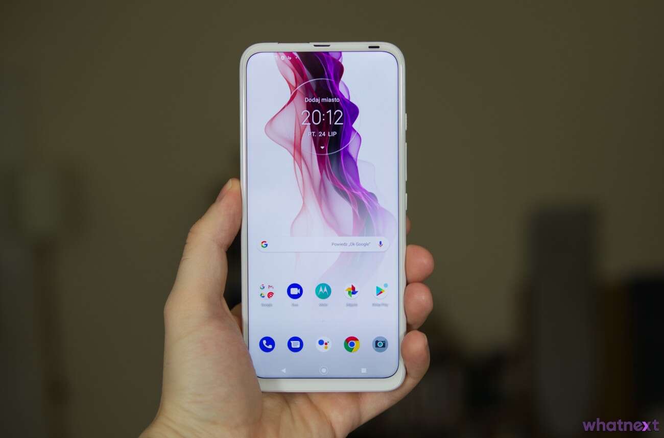 Przód wypełnia ekran bez jakichkolwiek wcięć. Według danych producenta zajmuje on 91% powierzchni frontu. Bardzo ładnie kontrastuje on z białymi ramkami w testowym egzemplarzu. U góry znajdziemy hit A.D. 2019 czyli wysuwany automatycznie obiektyw przedniego aparatu oraz tackę na karty. U dołu – złącze miniJack, głośnik mono i port USB C. Z lewej strony zaś przyciski regulacji głośności, on/off oraz… wywołujący asystenta Google! Z tyłu nie da się nie zauważyć mocno wystających obiektywów aparatu głównego oraz srebrnego logo Motoroli, będącego jednocześnie skanerem linii papilarnych. Sprytne i praktyczne!