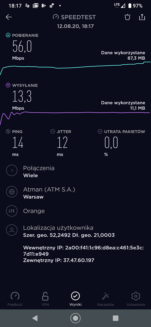 Jeśli chodzi o internet, to prędkość LTE w programie Speedtest w sieci Orange pod Warszawąwygląda następująco: 56 Mb/s pobieranie i 13,3 Mb/s w przypadku wysyłania danych. Oczywiście na obsługę sieci 5G liczyć tu nie możemy. Za to połączenie przez Wi-Fi było stabilne przez cały okres trwania testów, zarówno w paśmie 2,4 GHz, jak i 5 GHz.