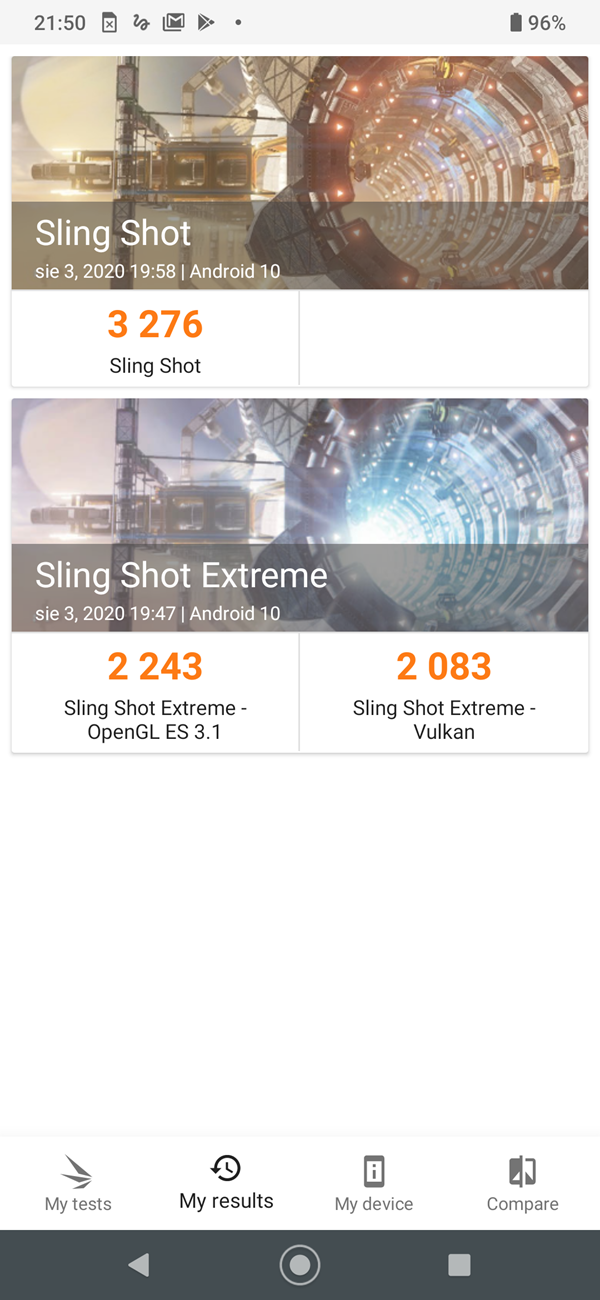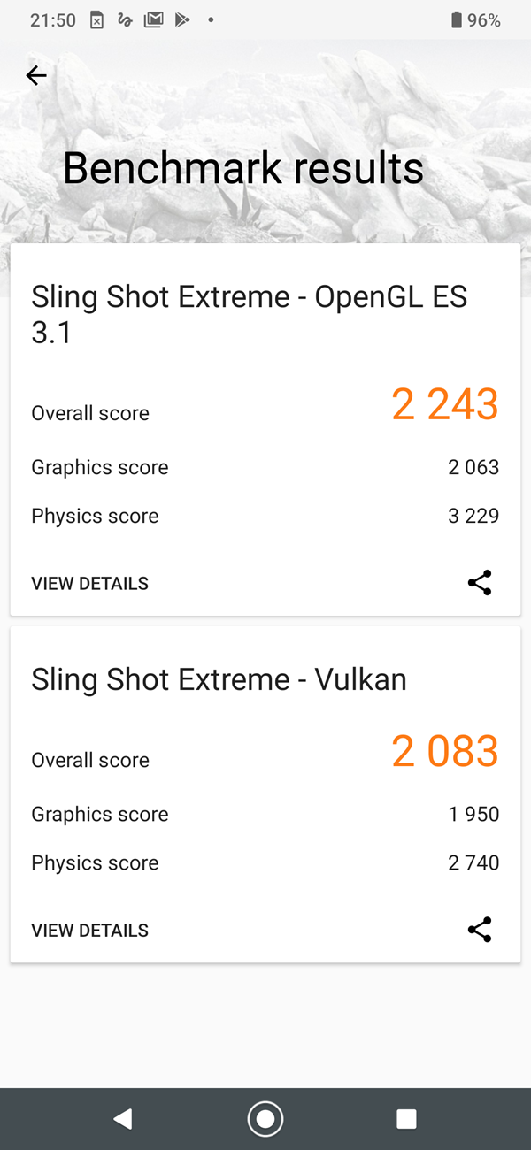 - 3D Mark (test Sling Shot Extreme) – 2243 pkt (OpenGL ES 3.1), 2083 pkt (Vulkan)