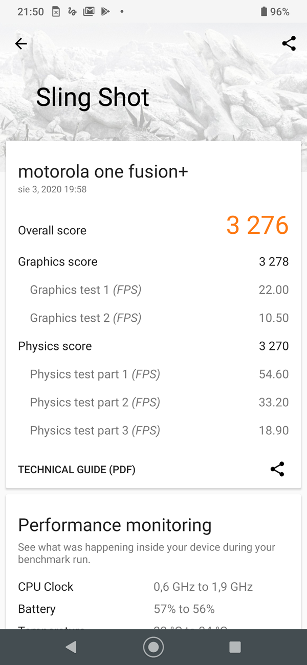 Na pokładzie nowej Motoroli znajdziemy średnio-półkowy układ amerykańskiej firmy Qualcomm – Snapdragon 730 wraz z grafiką Adreno 618 oraz 6 GB pamięci RAM. Wydajnościowo smartfon niewiele ustępuje droższej Motoroli Edge (recenzja TUTAJ), a znacząco przebija m.in. Samsunga Galaxy A51 (recenzja TUTAJ). Nie jest to najwydajniejszy smartfon za 1399 zł, ale jest bardzo dobrze.