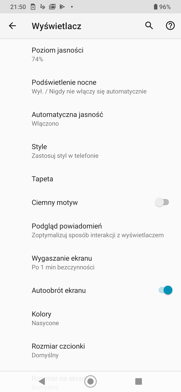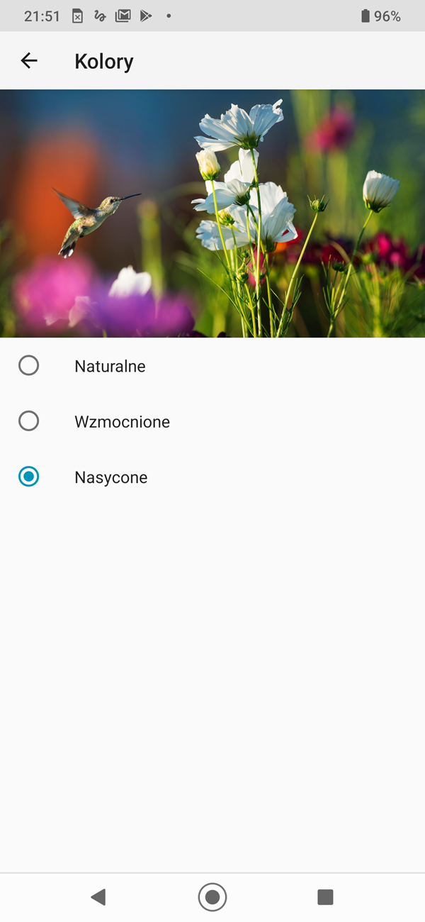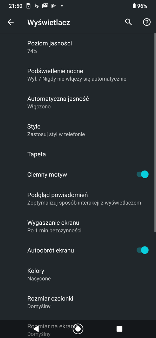 W ustawieniach możemy regulować nasycenie barw, włączyć filtr światła niebieskiego i ciemny motyw dla menu.