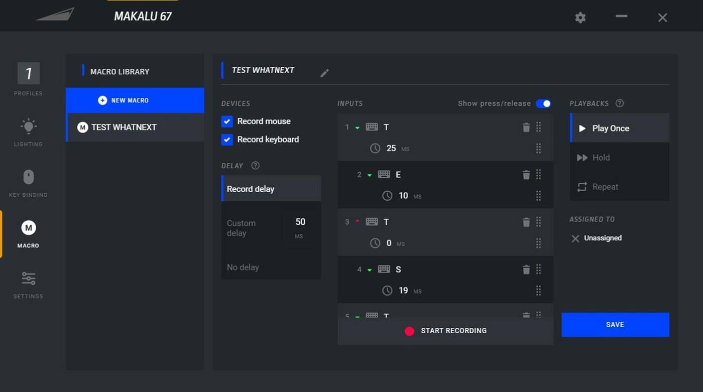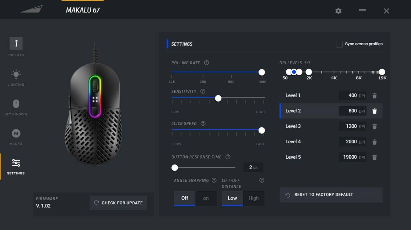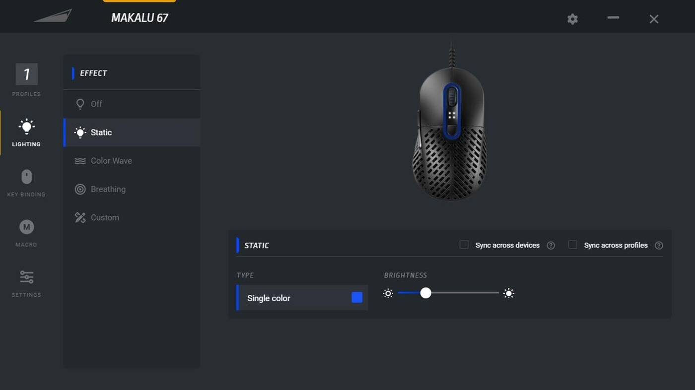 W przypadku Makalu 67 otrzymujemy tradycyjny zestaw opcji na czele z możliwością aktualizowania firmware, pięcioma profilami, zabawą podświetleniem, przypisywaniem funkcji do przycisków, tworzenia zaawansowanych makr i wreszcie ustawiania parametrów związanych z sensorem.