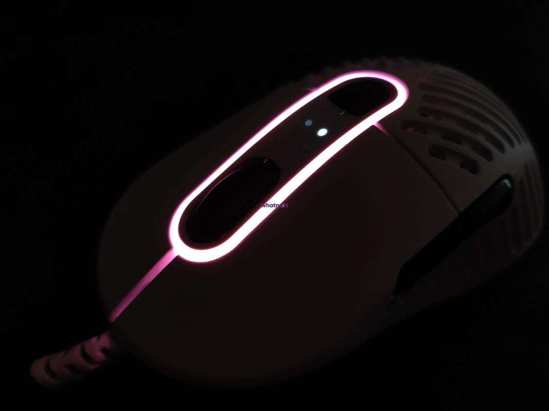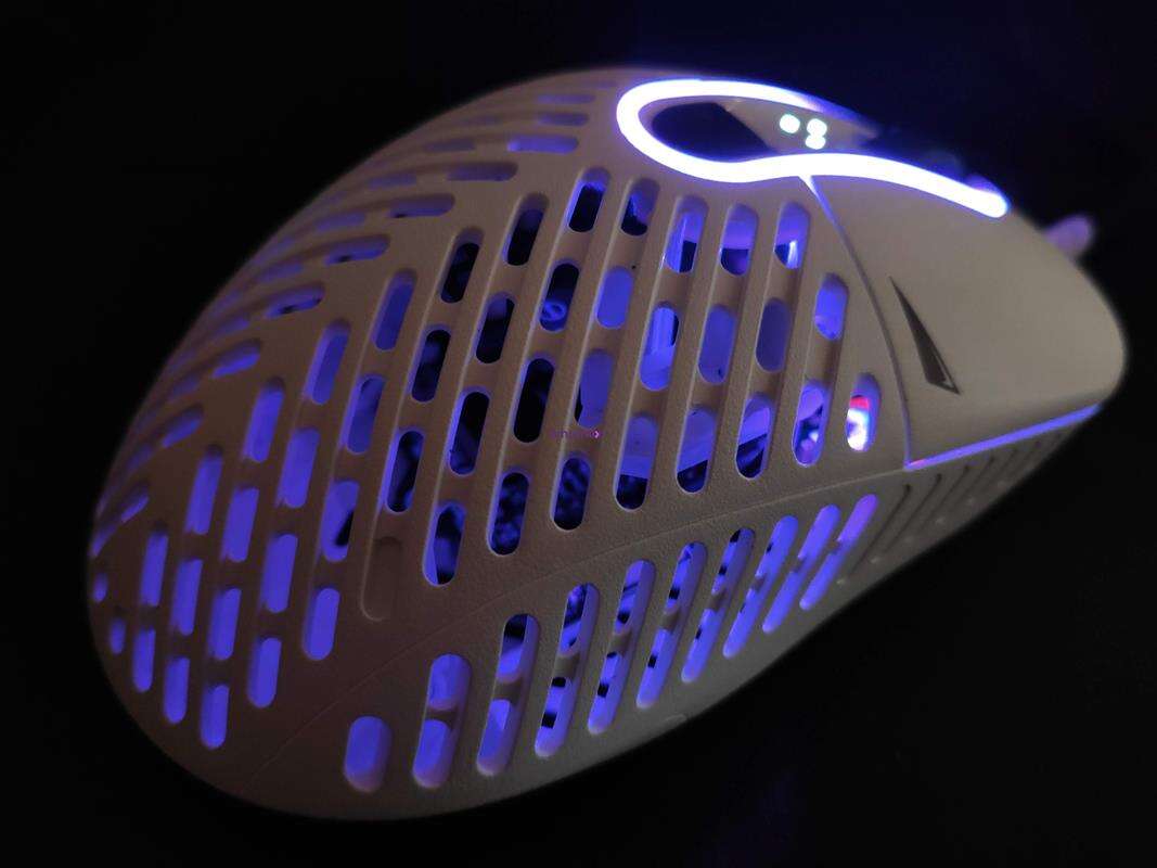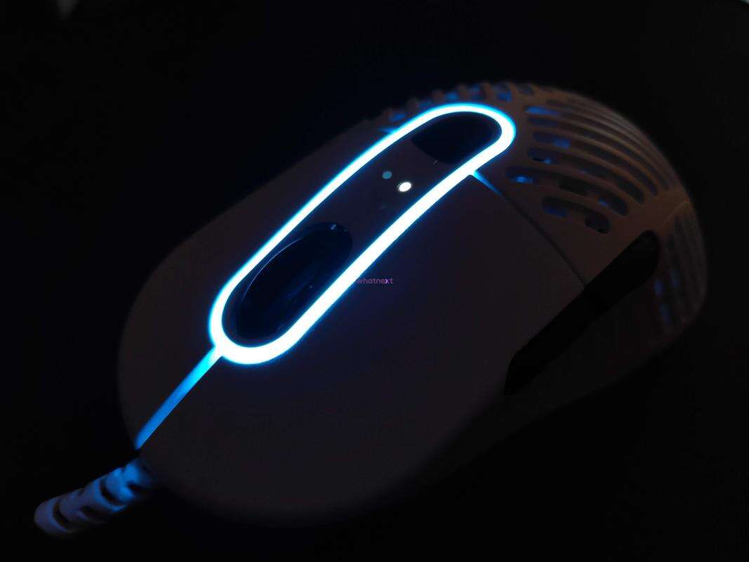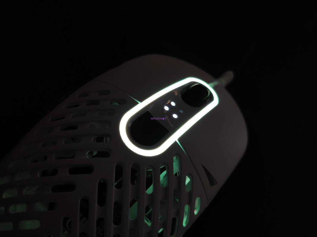 Skromnie, ale zdecydowanie elegancko. Makalu 67 posiada podświetlenie wyłącznie wokół sekcji z plastiku typu glossy, gdzie znalazła się rolka, przycisk funkcyjny i cztery podświetlane na biało punkciki, sugerujące nam poziom DPI, jaki wybraliśmy. Owalne podświetlenie ładnie współgra z identycznym kształtem każdej z perforacji, a bazuje na ośmiu diodach, których kolor możemy wybrać z całego kółka RGB.