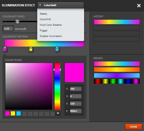 W Rival 3 Wireless nie liczcie na rozbudowane podświetlenie, bo to sprowadza się tylko do dwóch paseczków na rolce, które mogą rozbrzmieć magią RGB w czterech najpopularniejszych efektach z możliwością ustawienia częstotliwości trybów. Niestety brakuje w opcjach ustawienia jasności diod.
