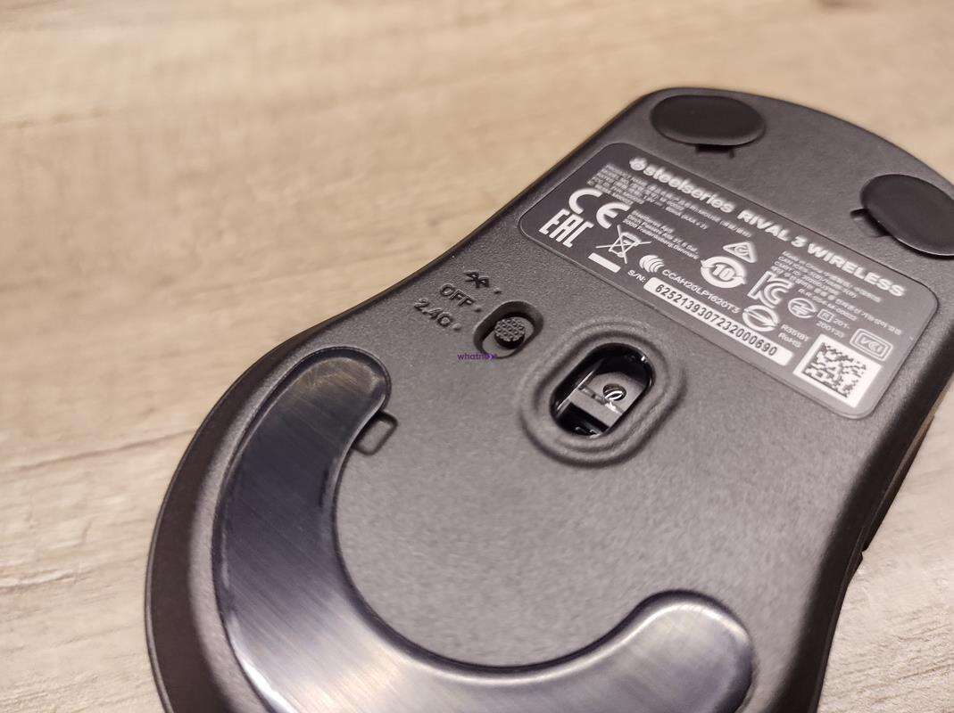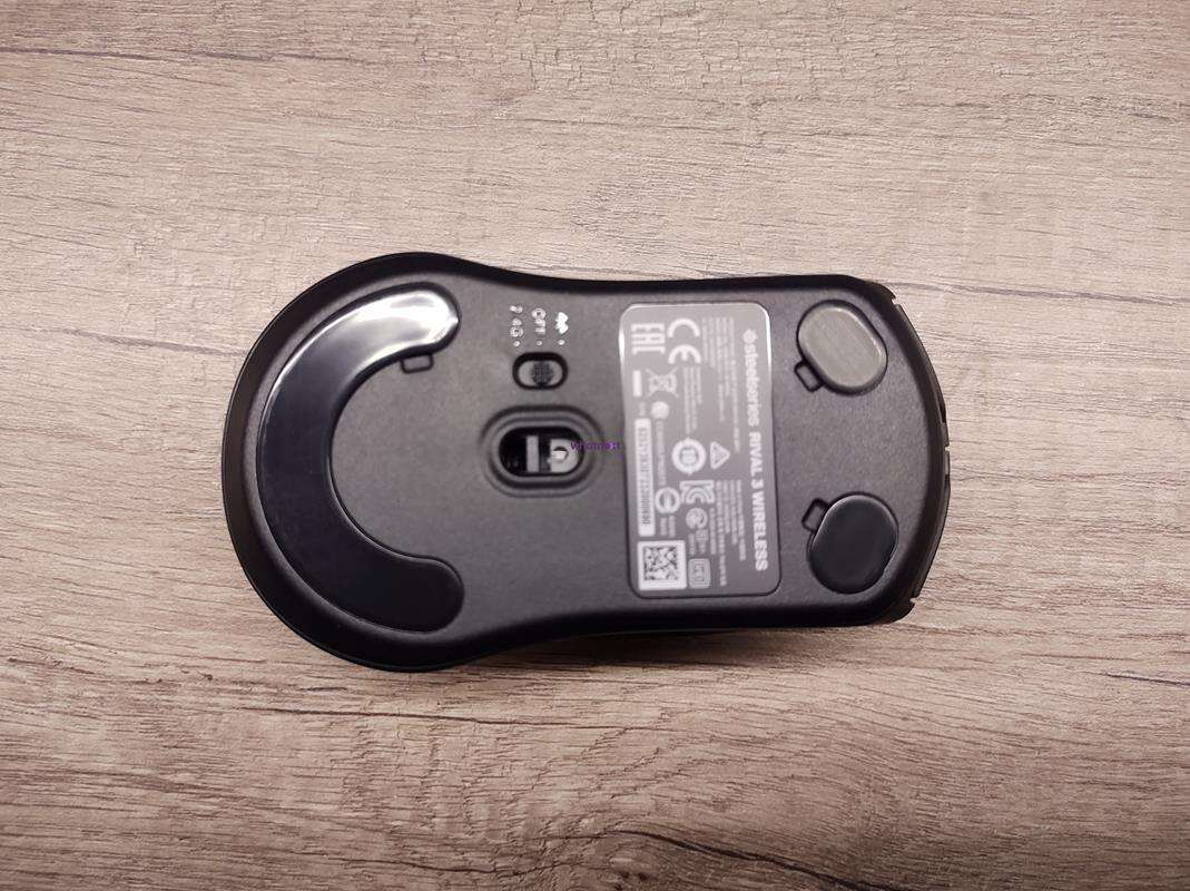 Szybka zabawa w przygotowanie Rival 3 Wireless do działania sprowadza się do wsadzenia przynajmniej jednej z baterii do stosownej luki. Ta znajduje się pod zdejmowanym grzbietem, gdzie również znajdziemy miejsce na odbiornik radiowy 2,4 GHz na USB. Następny krok, to już wybranie albo trybu Bluetooth, albo 2,4 GHz małym przełącznikiem na spodzie… i tyle. Można zaczynać grę.