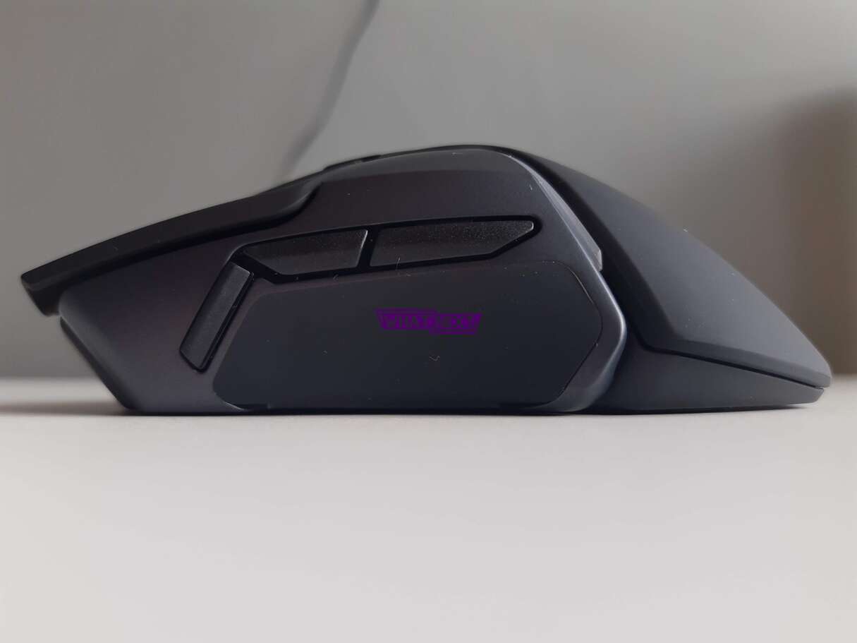 Jeśli idzie o przyciski, to mamy do dyspozycji tradycyjny zestaw dwóch głównych, rolki z gumowym wykończeniem oraz matowych przycisków bocznych (3) i funkcyjnych (1 do DPI nad rolką). Wyróżnia się z nich tylko ten jeden boczny, który został ułożony w stosunku do naszego kciuka pod kątem, ale jego dosięgnięcie jest sporym wyzwaniem bez odrywania dłoni od całości.