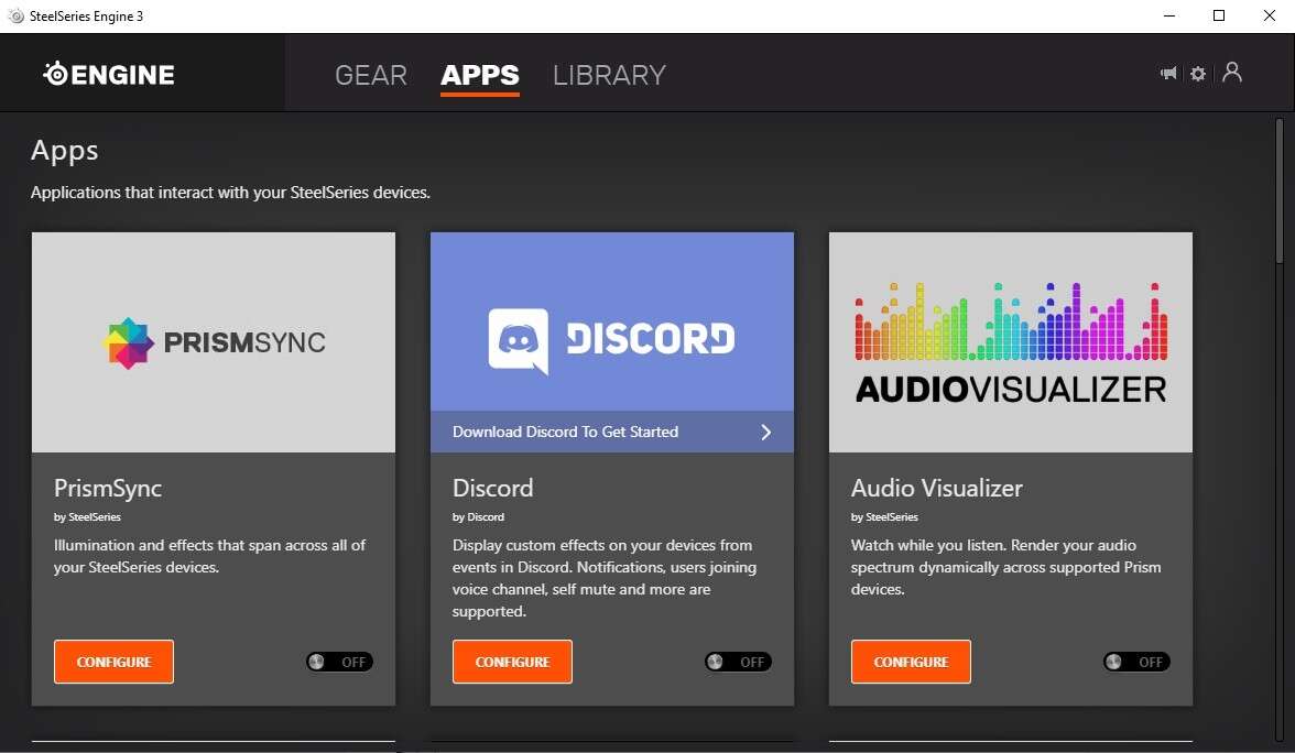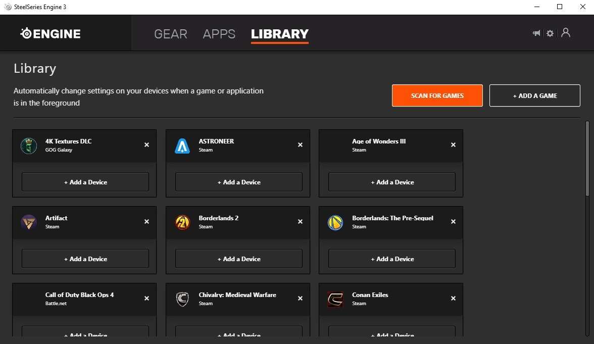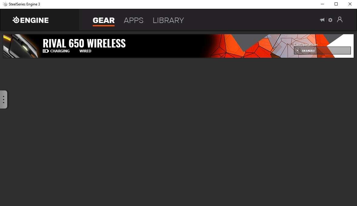 Nad Rival 650 wireless panuje aplikacja SteelSeries Engine 3, w którą już nie raz nurkowaliśmy. Główne menu opiewa na listę podpiętych aktualnie urządzeń, zakładkę z aplikacjami kompatybilnymi z urządzeniami SteelSeries (wiecie – różne podświetlenie zależnie od sytuacji) oraz obecnymi na naszym sprzęcie grami i programami do zaprzęgnięcia ich do określonych konfiguracji.