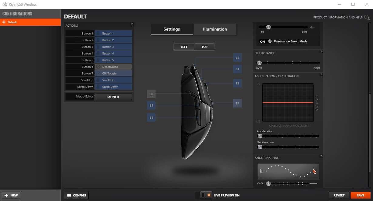 W niestandardowych ustawieniach znajdziemy możliwość dostosowania parametru LOD od poziomu LOW do HIGH, dostosowania/skorygowania akceleracji i deceleracji, predykcji (angle-snappingu) oraz częstotliwości odświeżania myszy do max 1000 Hz.