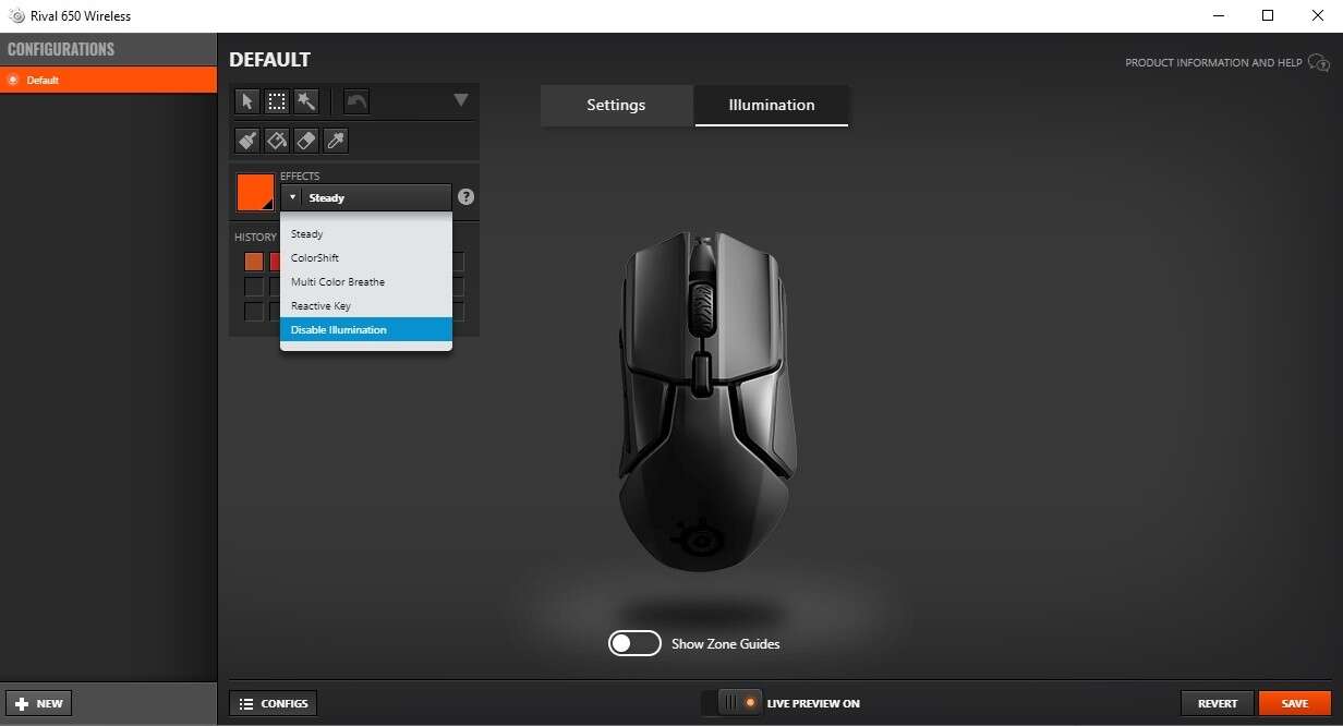 Należy jednak pamiętać o wyłączaniu myszy po zakończeniu gry, bo jeśli tego nie zrobimy, to przejdzie do trybu czuwania, nadal pobierając trochę energii. Fajne jest to, że producent pozwolił nam dostosować czas przechodzenia do tego trybu, w którym podświetlenie dezaktywuje się, aby jeszcze bardziej wydłużyć ten czas. To jest też dla nas pewnym wskaźnikiem poziomu naładowania, bo zaraz po włączeniu myszy scroll zacznie migać. Na zielono, kiedy bateria ma jeszcze ponad 75% mocy, na pomarańczowo, kiedy ma jej już od 25 do 74% i na czerwono poniżej 25%.