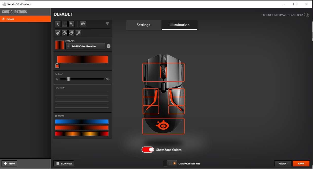 Wchodząc w szczegóły myszy, dostajemy możliwość stworzenia wielu profili i dostosowania myszy do naszych potrzeb. Znalazło się tutaj standardowe przypisywanie funkcji do klawisza z możliwością połączenia danej aplikacji do jednego z nich, czy ustawienie czułości na dwóch poziomach. Tyle z tradycyjnych dodatków, bo resztę uzupełnia możliwość ustawienia czasu, po którym mysz przejdzie do trybu czuwania (od 1 do 20 minut) oraz włączenia trybu inteligentnego podświetlenia. To jest świetne, bo wyłącza diody wtedy, kiedy myszki w domyśle nie widzimy, czyli podczas ruchu. Działa to po prostu fenomenalnie.